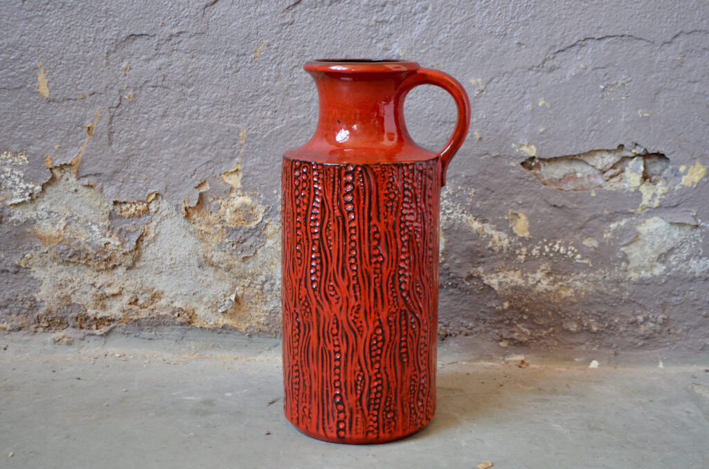 La production de faïence en Allemagne des années 60 et 70 est impressionnante. Il semble que les potiers rivalisent d’imagination pour proposer des pièces aux formes et couleurs aussi diverses qu’audacieuses. Ce grand vase rouge signé “Carstens Tonnieshof” ne déroge pas à la règle avec son épais émaillage décoré de scarifications verticales. C’est une évocation d’ornementions tribales ou ethniques. Sa belle forme et son aspect original seront en valeur sur une jolie enfilade, au sol ou sur une étagère scandinave !