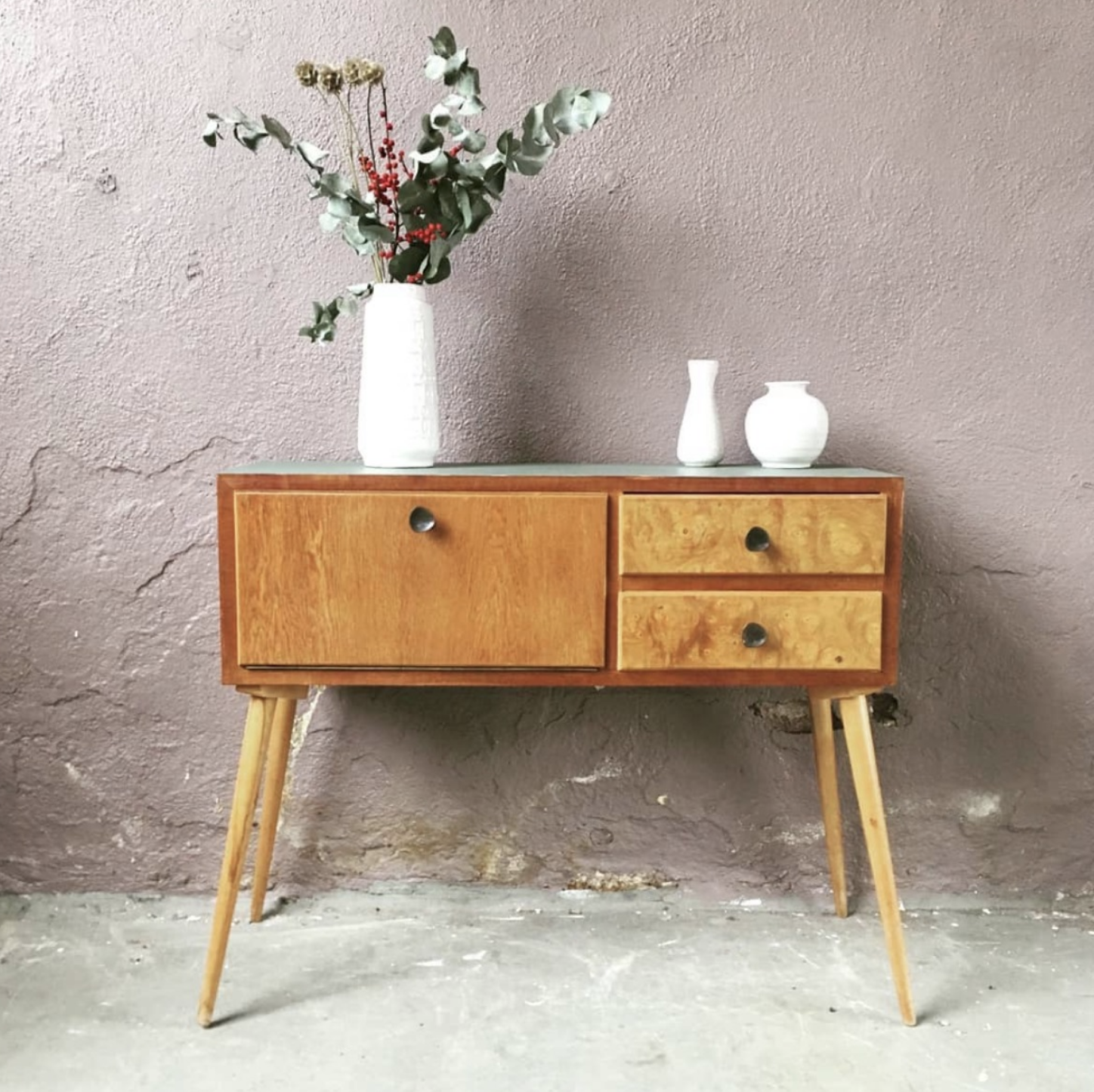 Journée pluvieuse mais la lumière était belle!!! On en profite pour vous présenter les derniers arrivés à l’atelier! Cet inclassable petit meuble haut perché dévoile ces longues gambettes devant notre objectif…
