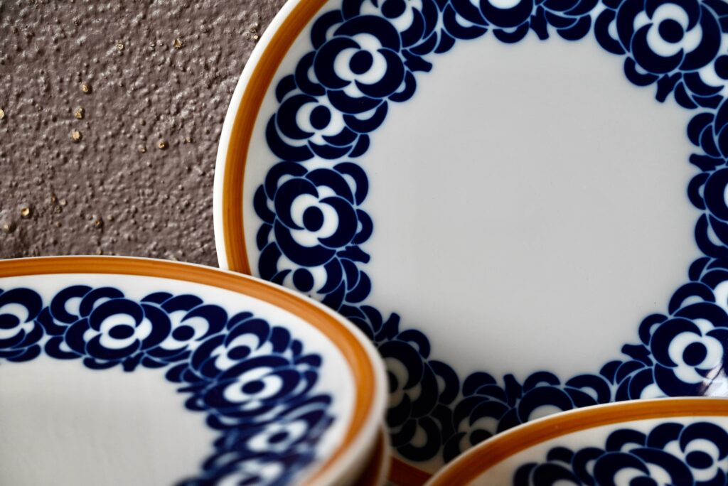 Ces assiettes plates proviennent de la faïencerie Hutschenreuther située à Arzberg en Allemagne. Elles sont décorées de jolis motifs floraux bleus qui s’expriment dans un esprit joyeusement pop.