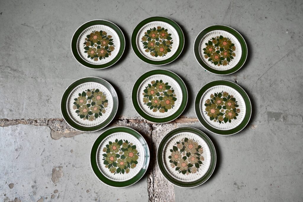 Les assiettes à repas sont de belle taille. La série est constituée de 8 pièces. La vaisselle est estampillée du logo Winterling sur l’envers. Quelques traces d’usage sont visibles, 2 des assiettes sont dans des teintes légèrement différentes.