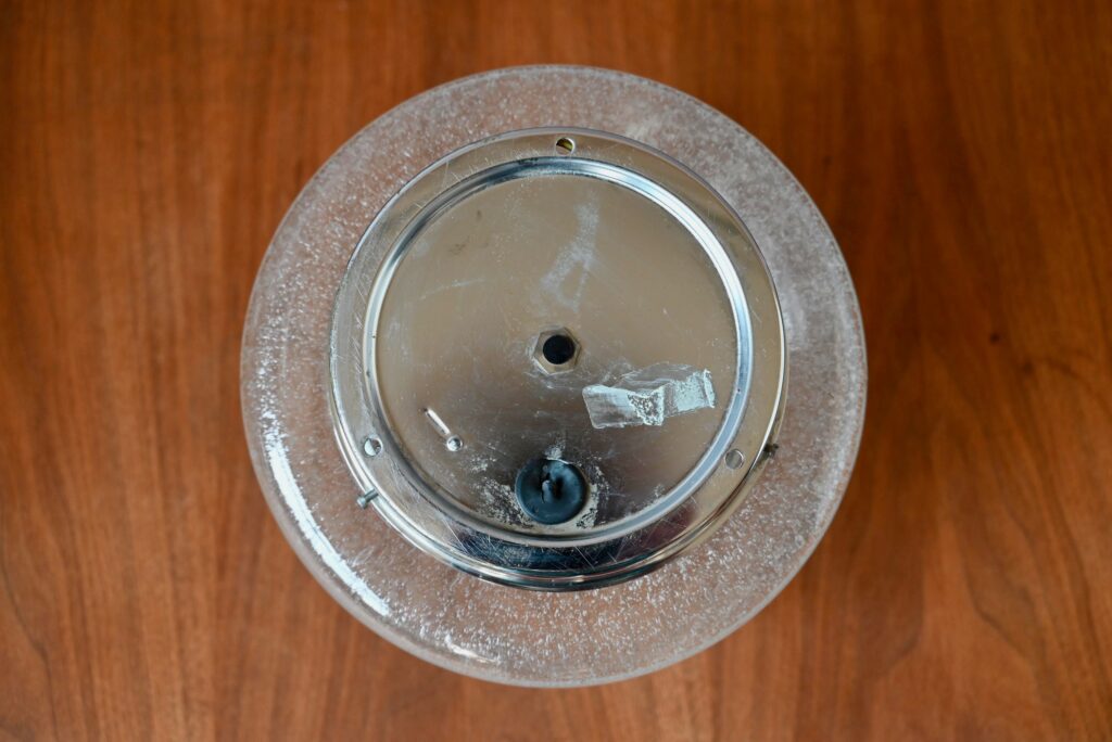 Cette superbe applique vintage est en verre bullé. Elle peut être utilisée en applique comme en plafonnier. De forme hémisphérique, elle est constituée d’un déflecteur en verre, porté par un support en métal argenté. Cette lampe très décorative apporte une touche raffinée et sophistiquée à l’ambiance intérieure. Le travail particulier du verre offre une tonalité douce et particulière à l’éclairage.