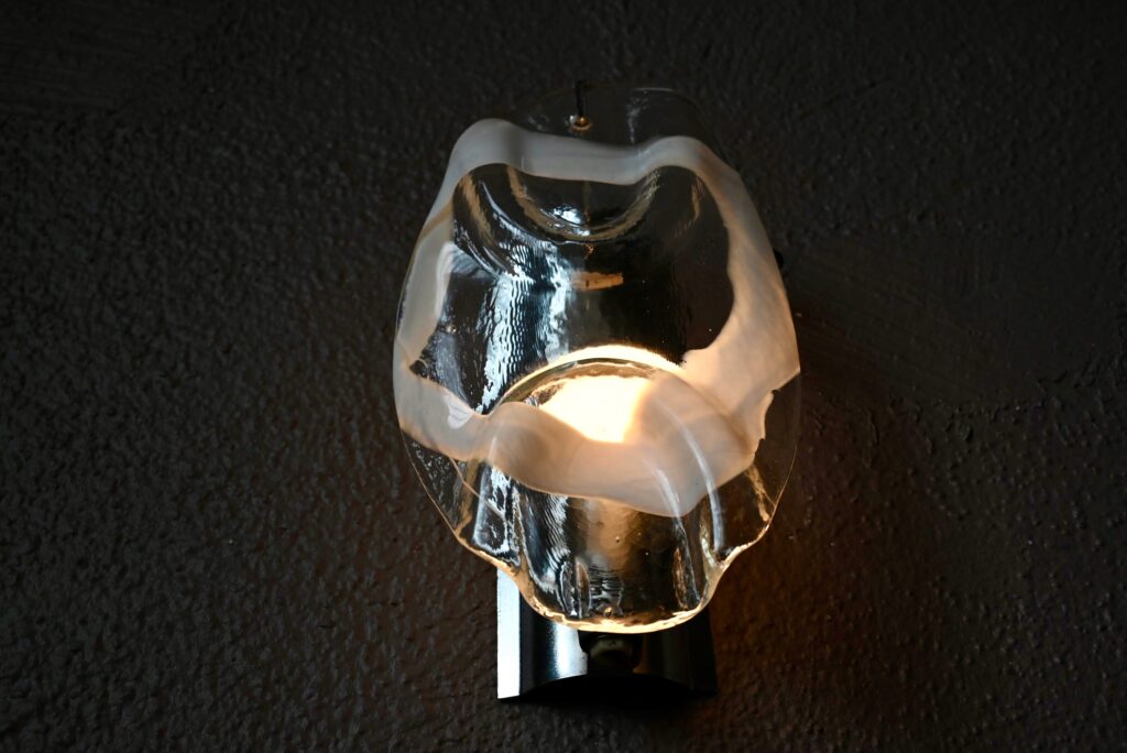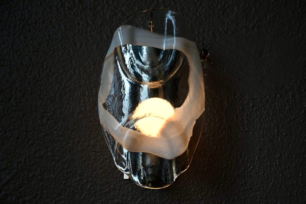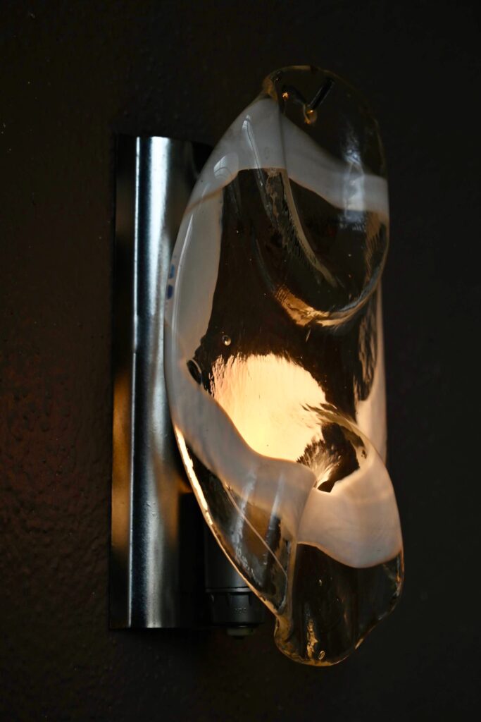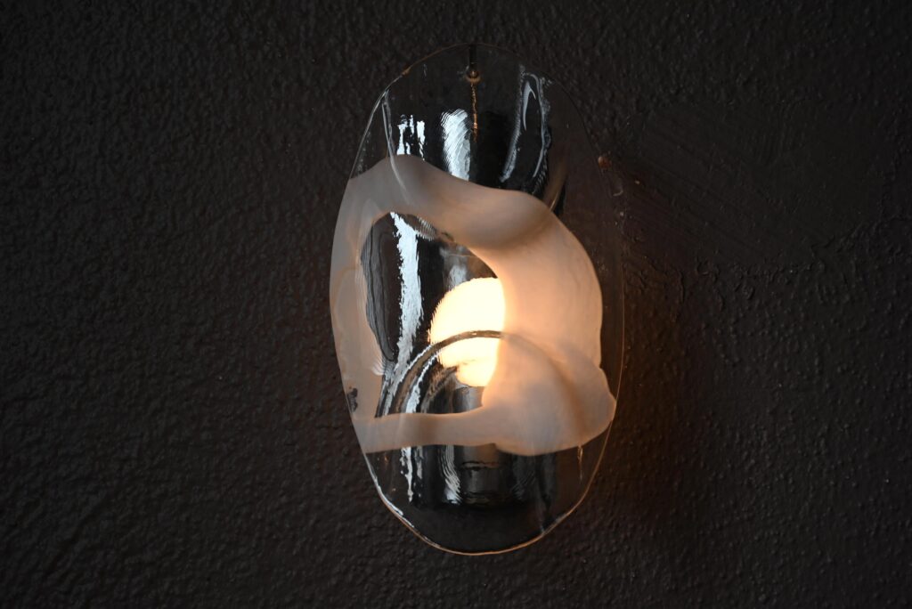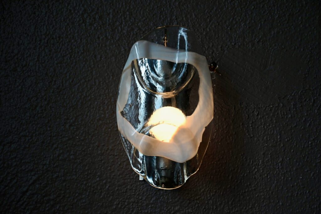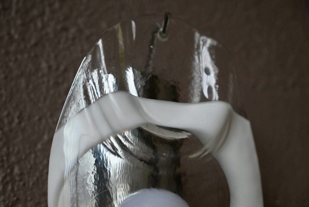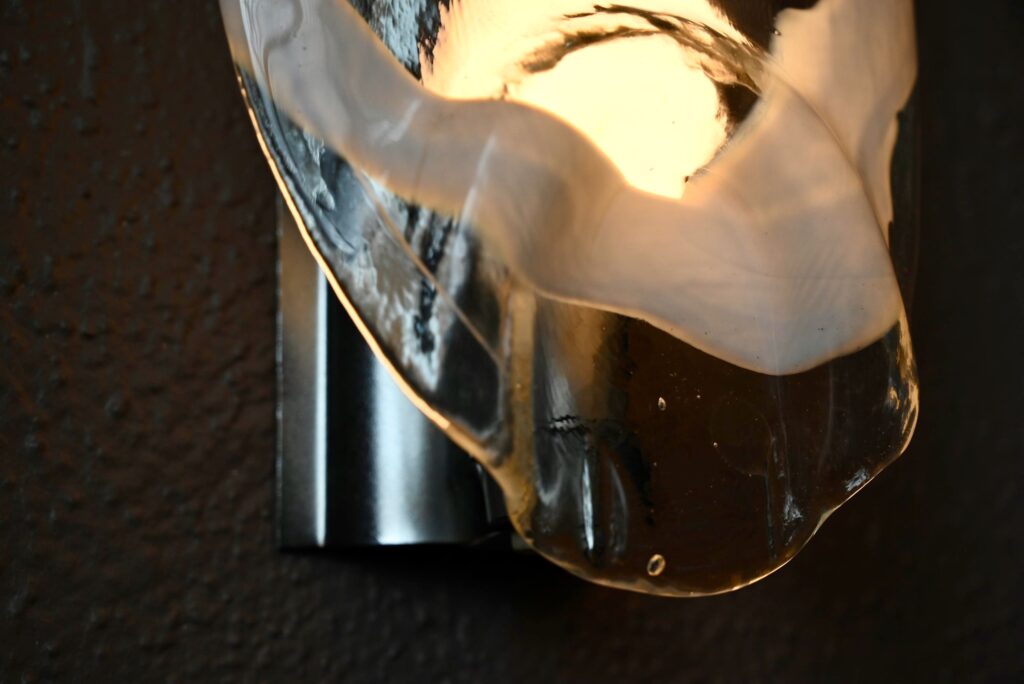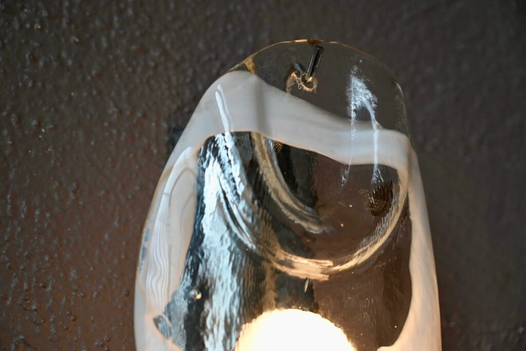 Originale et pleine de caractère, cette applique des années 60 est réalisée en verre de Murano de Mazzega. La “tuile” est en verre transparent texturé épais, très proche de la matière. Un cercle de verre blanc aléatoire rehausse l’ensemble et apporte de la profondeur à chaque applique. La plaque de verre est suspendue à un sobre élément métallique, lui offrant une allure légère et délicate. Nous apprécions le travail artisanal des maîtres verriers, emprunt d’un savoir-faire historique, d’élégance et de modernité.