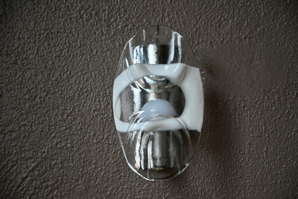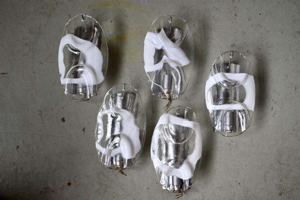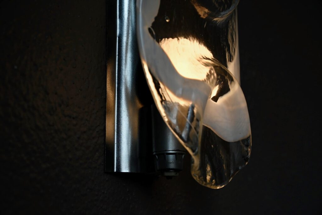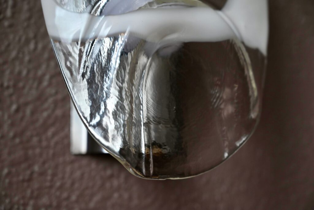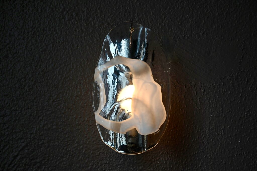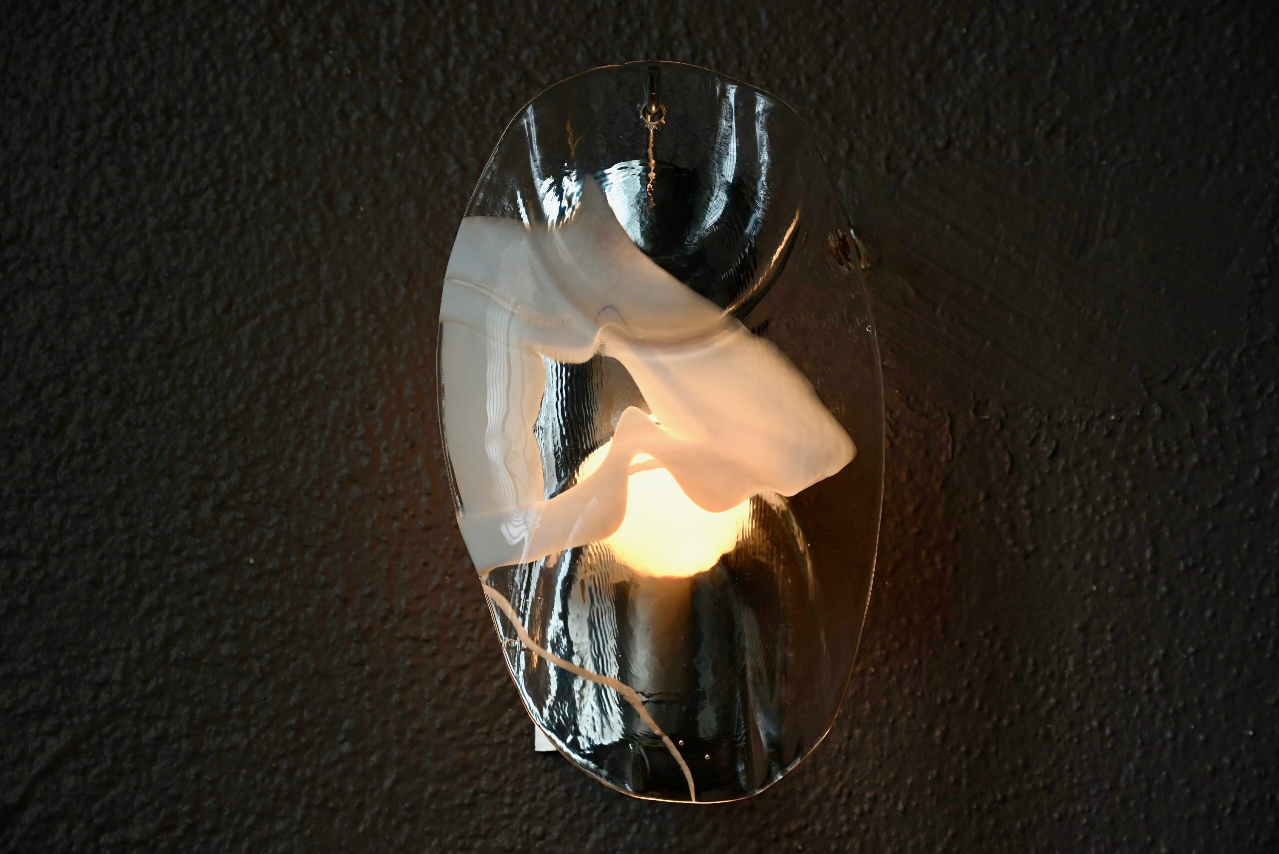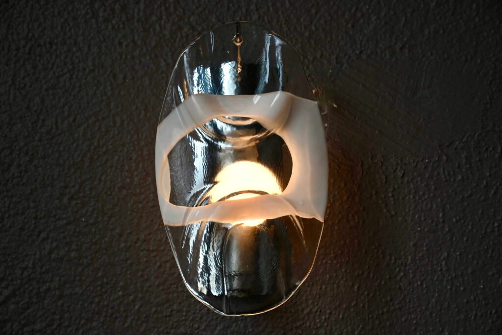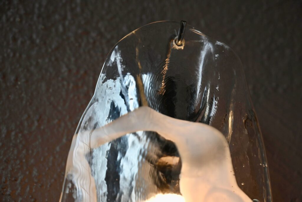 Originale et pleine de caractère, cette applique des années 60 est réalisée en verre de Murano de Mazzega. La “tuile” est en verre transparent texturé épais, très proche de la matière. Un cercle de verre blanc aléatoire rehausse l’ensemble et apporte de la profondeur à chaque applique. La plaque de verre est suspendue à un sobre élément métallique, lui offrant une allure légère et délicate. Nous apprécions le travail artisanal des maîtres verriers, emprunt d’un savoir-faire historique, d’élégance et de modernité.