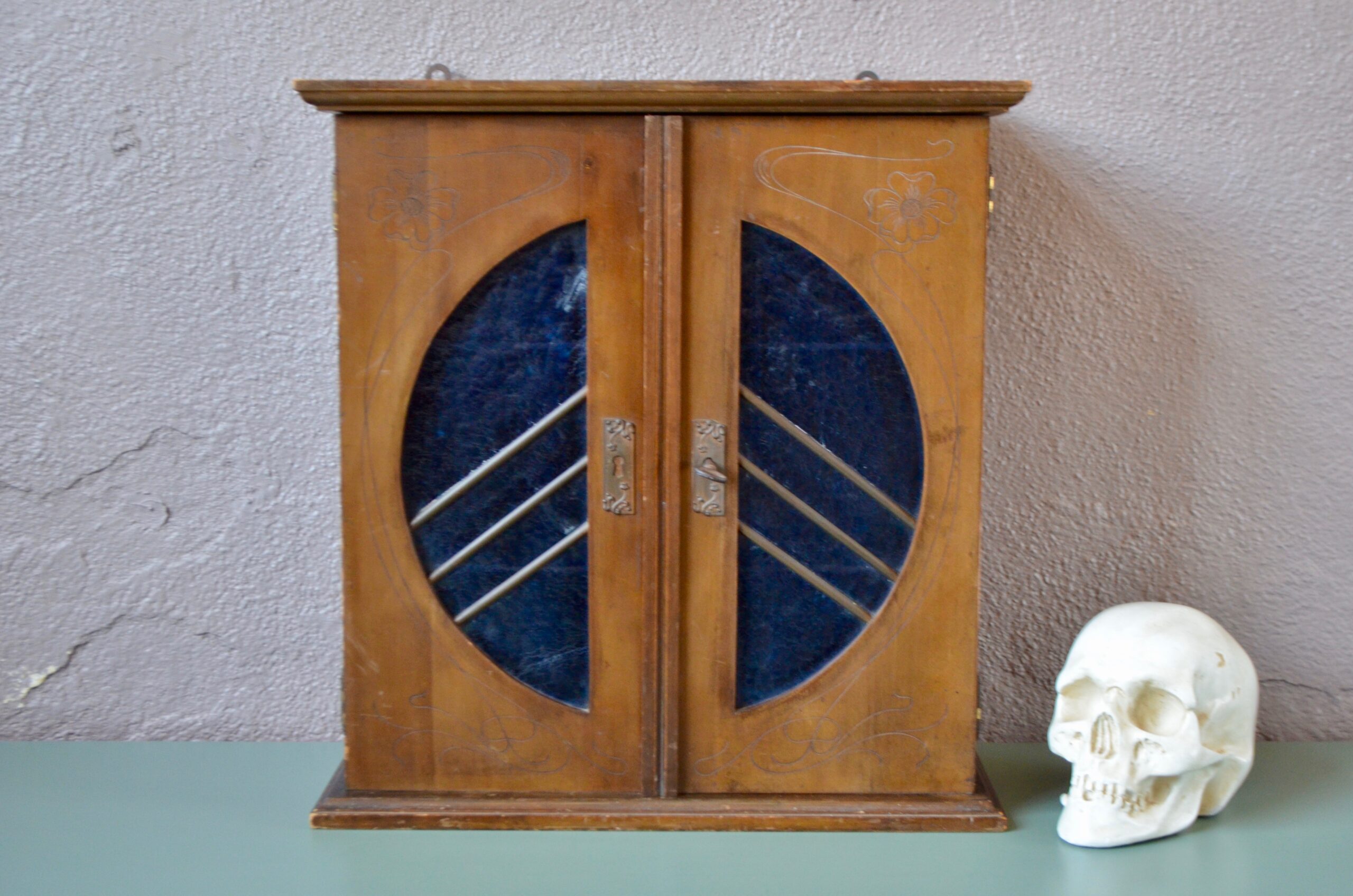 Dans un style résolument Art Nouveau, cette superbe armoire murale rétro est de toute beauté. Caisse en bois, décoration gravée et portes vitrées bleu, nous sommes sous le charme de son ornementation et de ses finitions de belle qualité. Le décor végétal mêle la poésie à la géométrie du vitrail.