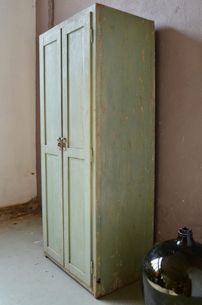 Patine divine assagie par une couleur vert eau très tendre, ce vestiaire d’atelier bouscule les âmes. En bois massif, l’armoire est de belles dimensions et de très bonne facture. Elle date des années 20 et occupait il y a quelques années encore un atelier. Son vaste caisson permet d’imaginer une penderie dans une entrée ou des étagères pour le linge de maison. Nous aimons énormément les portes panneautées, les loquets à pression et cette peinture ancienne douce et grunge à la fois, qui parle d’un temps que les moins de 20ans…