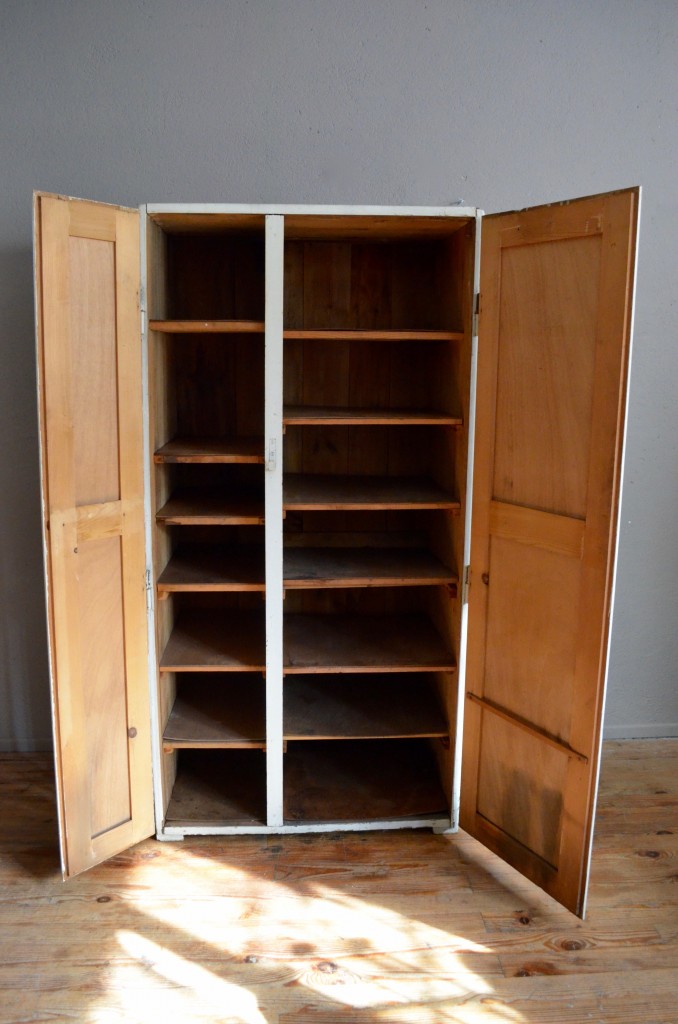 L’armoire ancienne est en pin peint en blanc. Fermée par deux portes battantes avec fermeture aimantée, l’intérieur est aménagé avec de nombreuses étagères. Le vestiaire est ancien et date certainement des années 40. Le meuble est en très bel état, le bois est sain, les fermetures sont fonctionnelles. La peinture présente une belle patine d’usage.