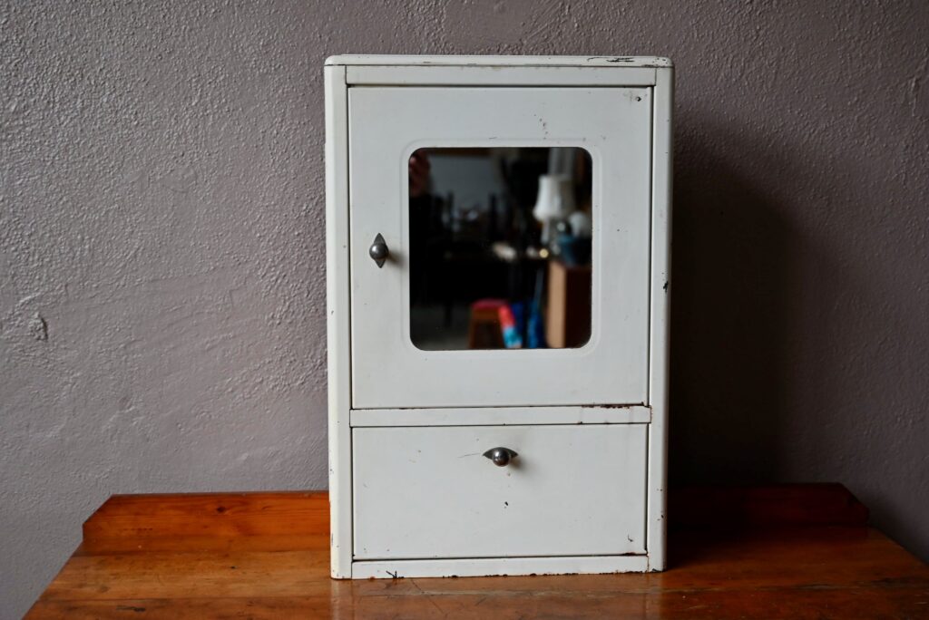 Voici un bien joli meuble de pharmacie à miroir datant des années 40. Avec ses lignes alliant géométrie stricte et bords arrondis, son look est très typé Art Déco. Le petit meuble de pharmacie est en métal, sa peinture blanche est patinée par les ans, ce qui lui donne une allure un peu indus. Elle dispose d’un miroir en façade, d’un compartiment à porte battante ainsi que d’étagères à l’intérieur. Pratique et esthétique, elle sera parfaite en déco de salle de bain ou détournée en meuble d’entrée.