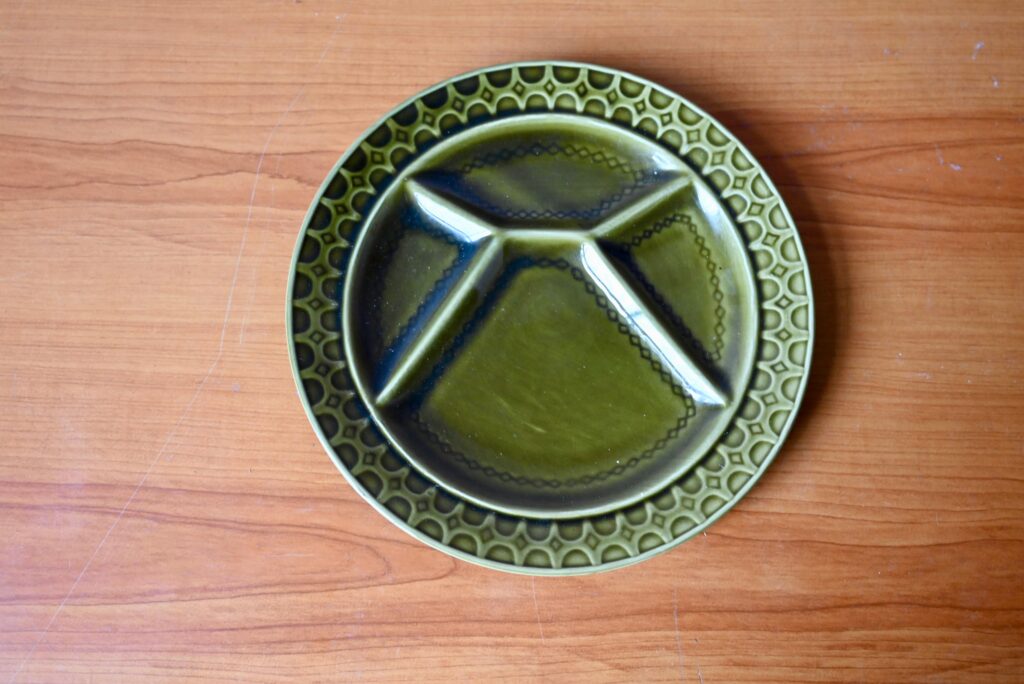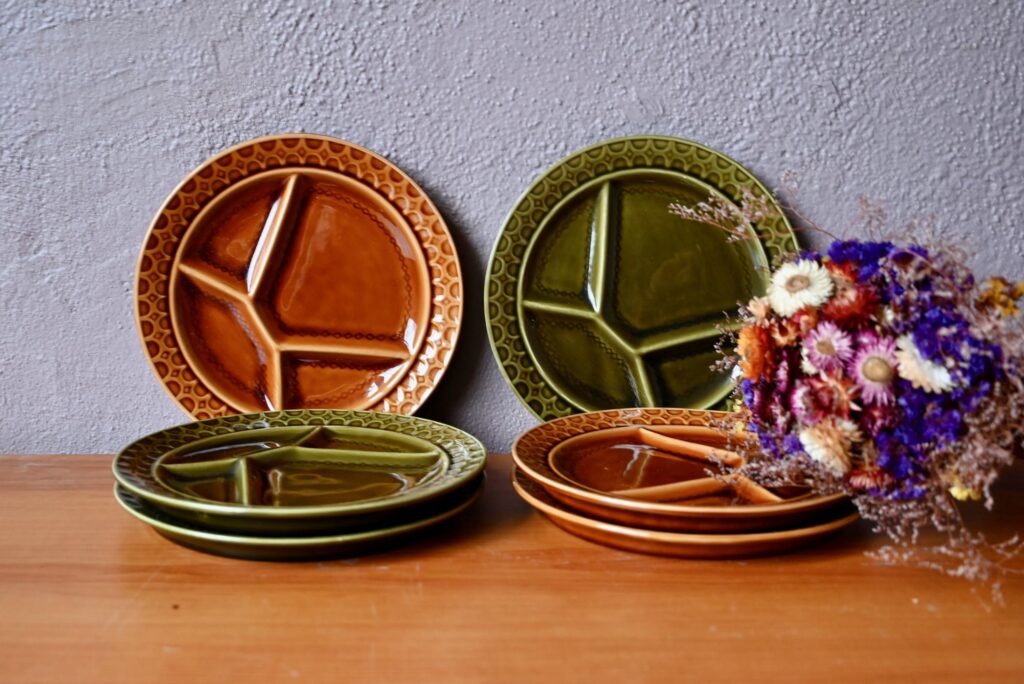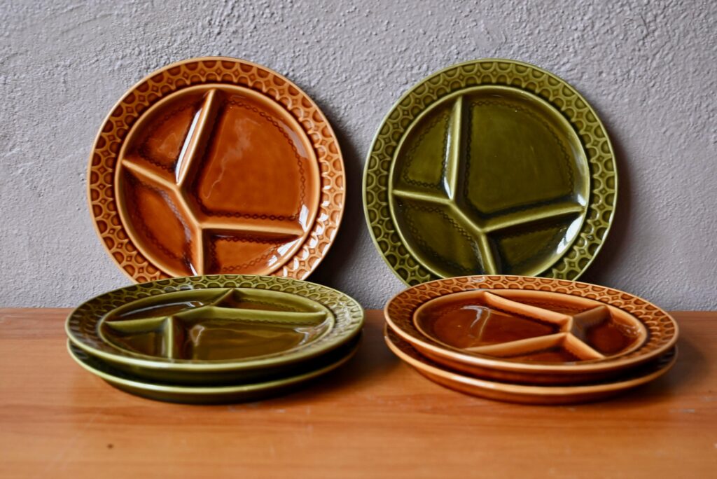 La série d’assiettes à compartiments Sarreguemines est ancienne et date des années 60. Elle est en parfait état, la faïence est brillante et les couleurs préservées. Les assiettes sont estampillées sur l’envers.