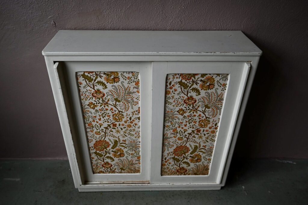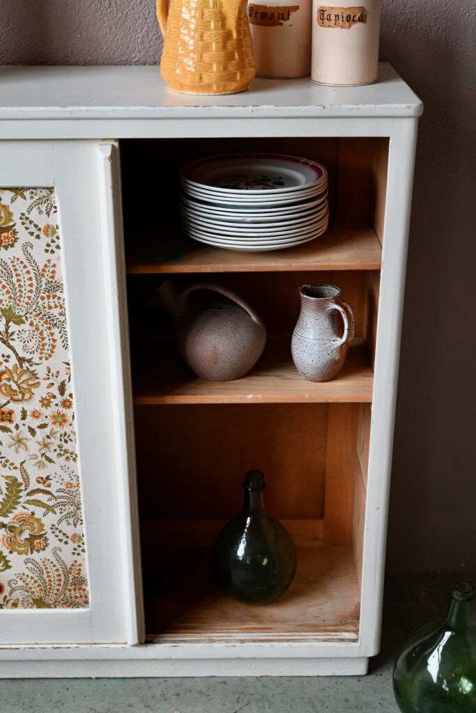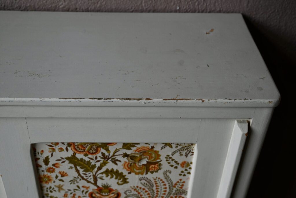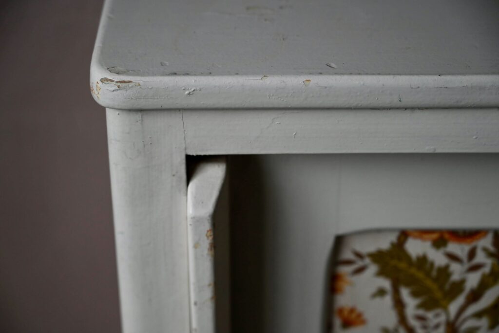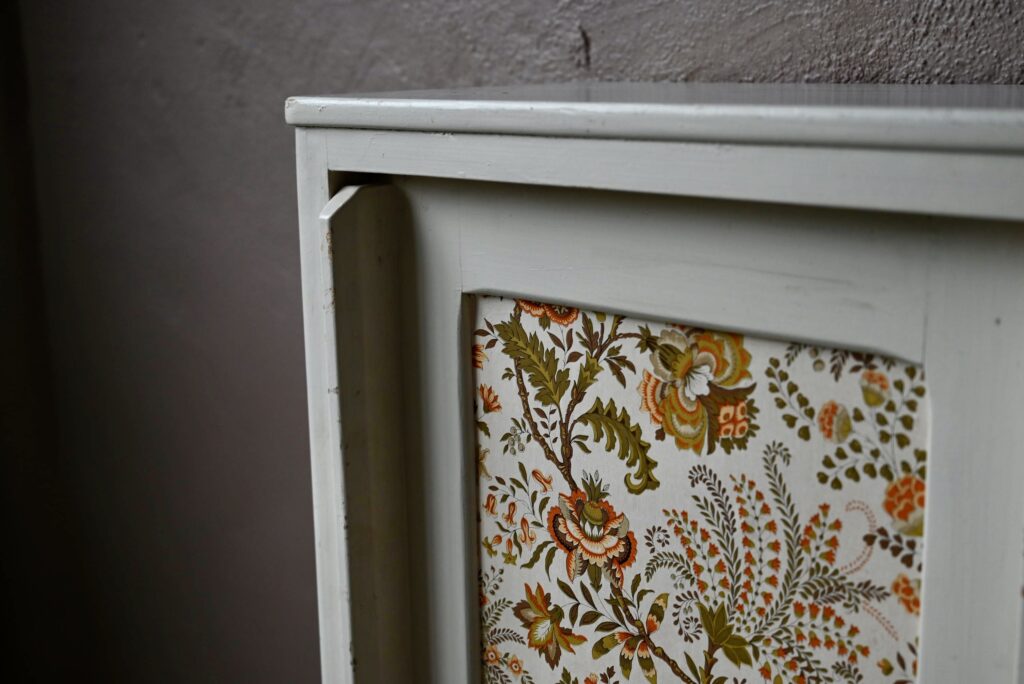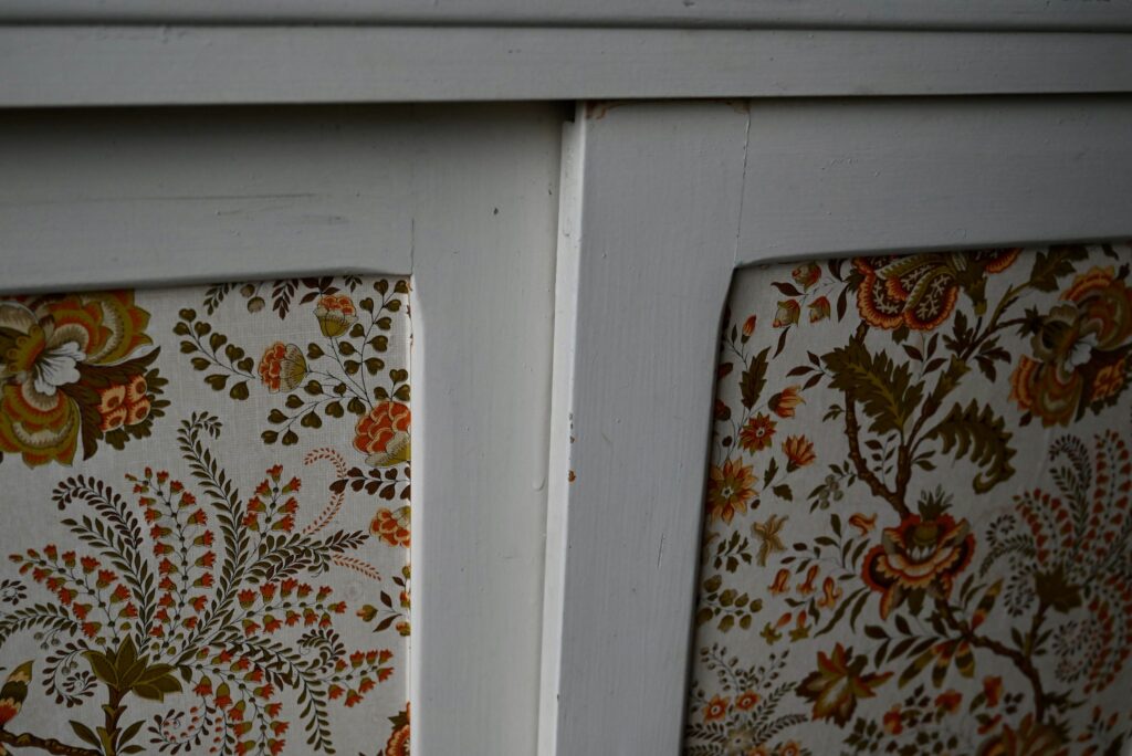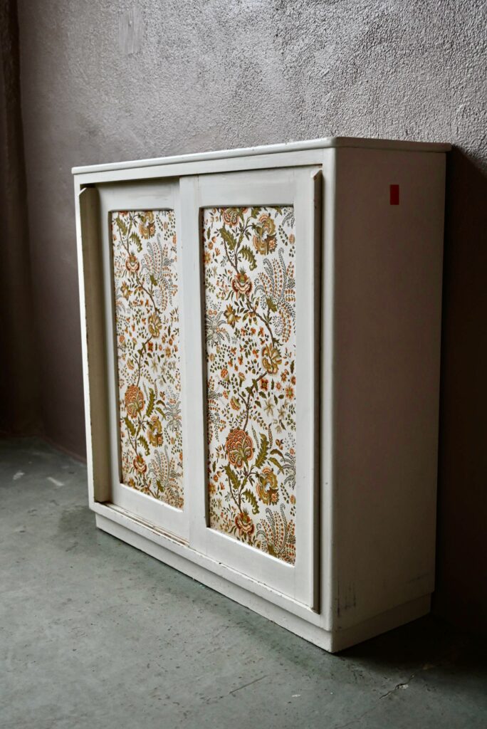 Le buffet vaisselier est de belle facture, an bois massif. Le caisson comporte 2 portes coulissantes aux poignées saillantes sur toute la hauteur. Un papier peint fleuri dans les tons vert-jaune est présent sur les portes. La peinture blanc crème du meuble est patinée et présente quelques traces et éclats, visibles en photo. Sur chaque flanc une marque non-peinte est visible.