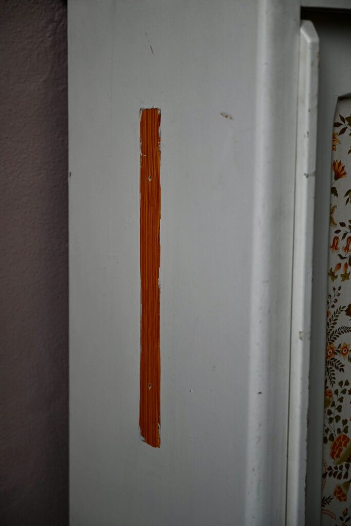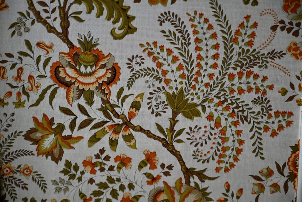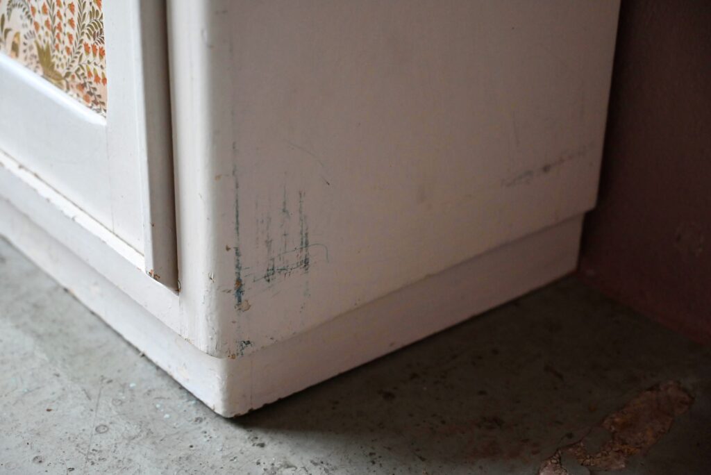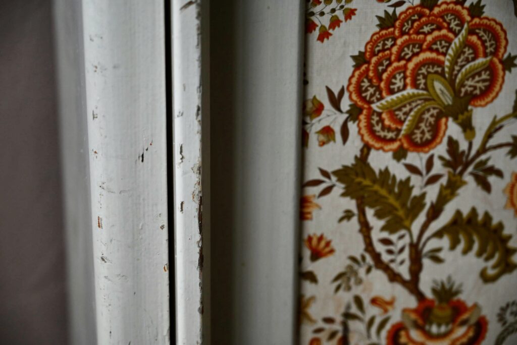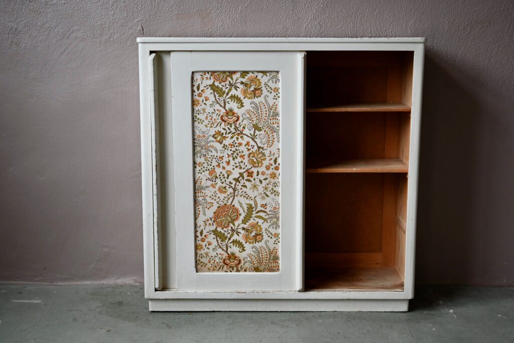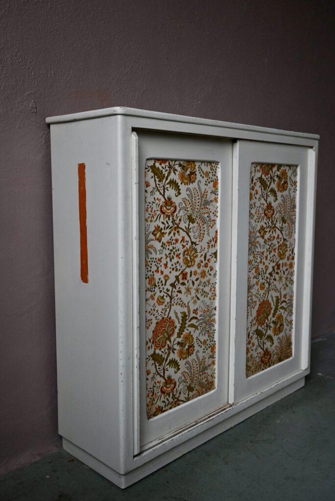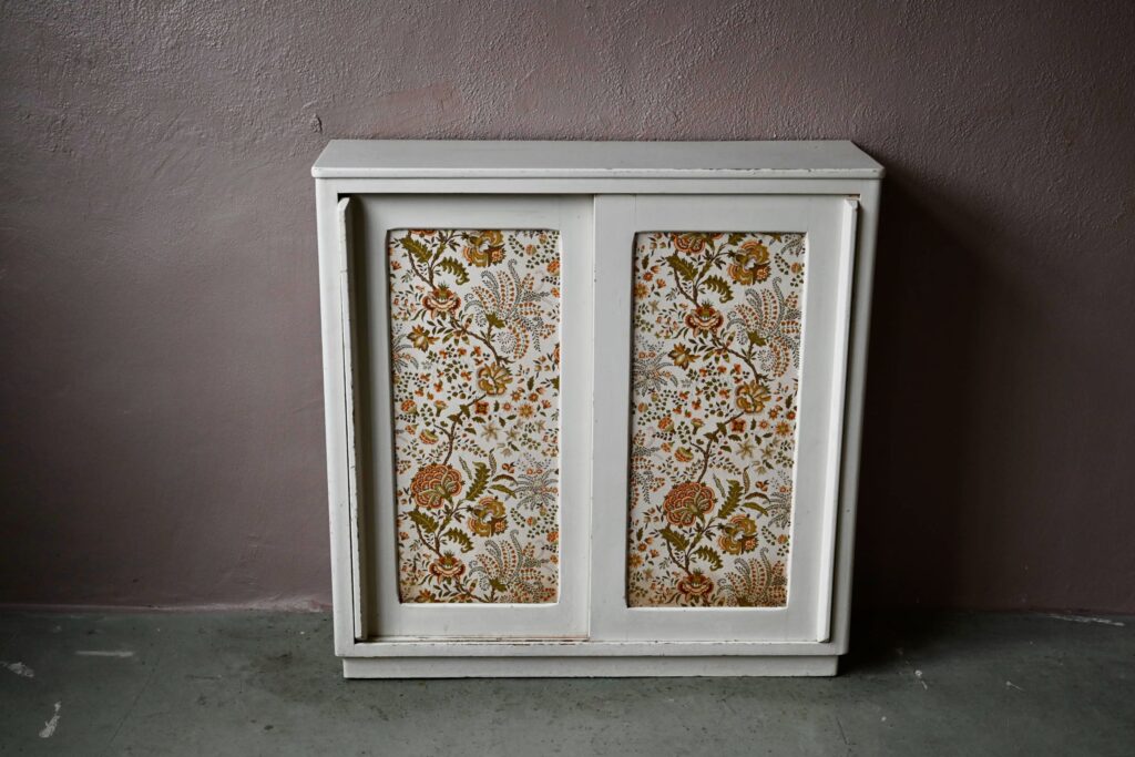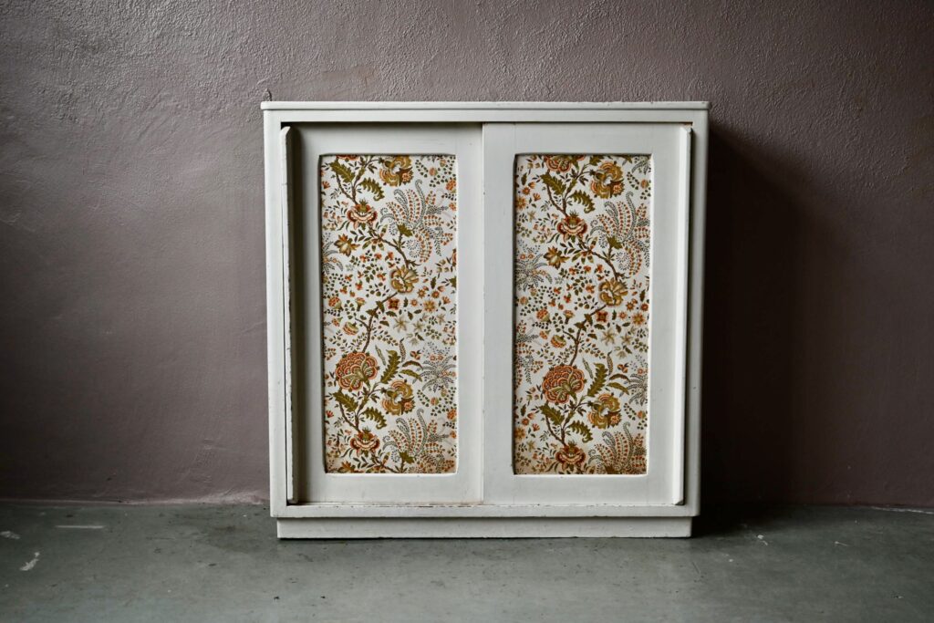 Le buffet vaisselier est de belle facture, an bois massif. Le caisson comporte 2 portes coulissantes aux poignées saillantes sur toute la hauteur. Un papier peint fleuri dans les tons vert-jaune est présent sur les portes. La peinture blanc crème du meuble est patinée et présente quelques traces et éclats, visibles en photo. Sur chaque flanc une marque non-peinte est visible.