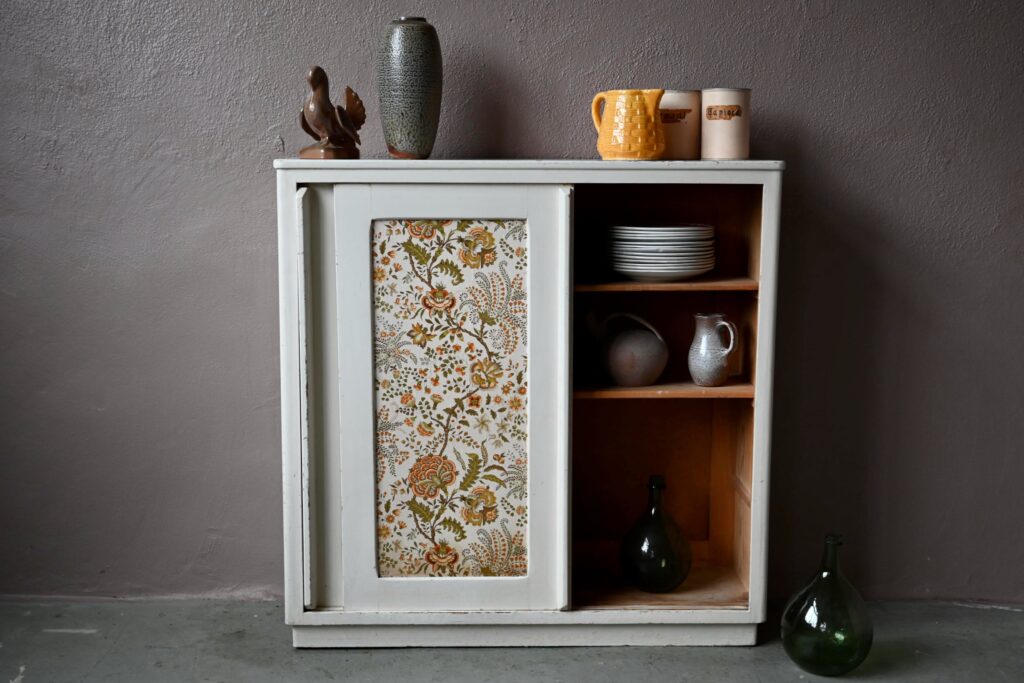 Ce beau meuble à l’allure bohème et élégante joint l’utile à l’agréable. Il est l’atout parfait pour le rangement comme pour la déco. Le bahut est doté de 2 larges portes coulissantes ouvrant sur un vaste caisson à étagères. Nous aimons ses lignes utilitaires presque strictes à peine atténuées par des lignes douces, des poignées de porte délicatement saillantes. Le buffet à l’esprit bohème est de fabrication soignée. Dans une cuisine à la déco éclectique ou une chambre d’enfant rétro, ce meuble des années 40 a un charme indéniable!