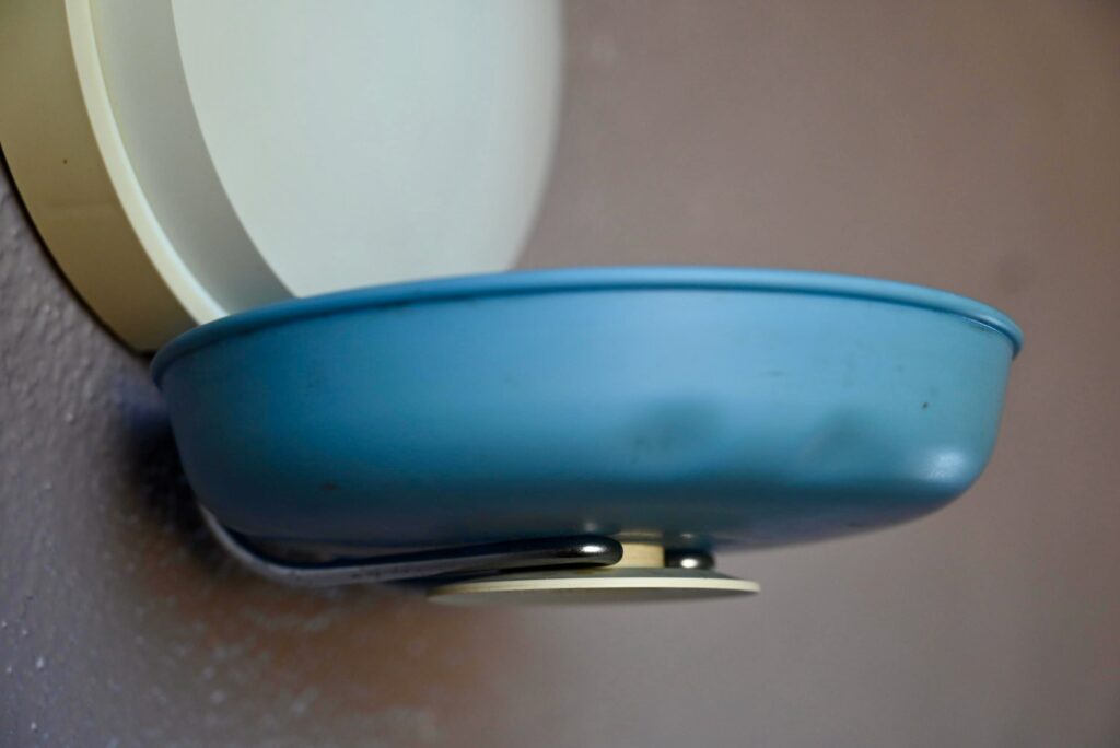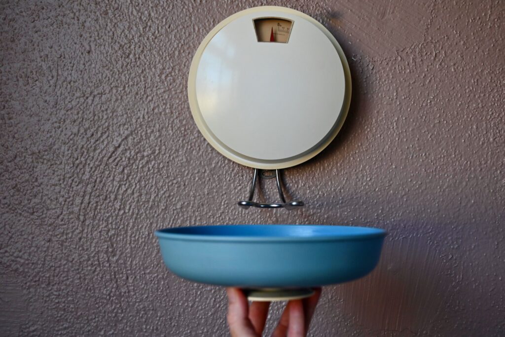 La balance est ancienne et date des années 60. Elle se fixe au mur de la cuisine. La balance possède très beau design. Le système de balance se fixe au mur, le bol en métal vient se fixer dessus, il est amovible. En métal bleu, il présente quelques marques et déformations visibles en photo. La balance murale fonctionne et est signée.