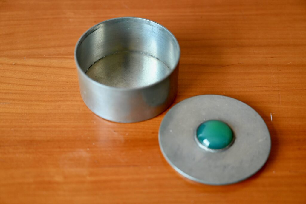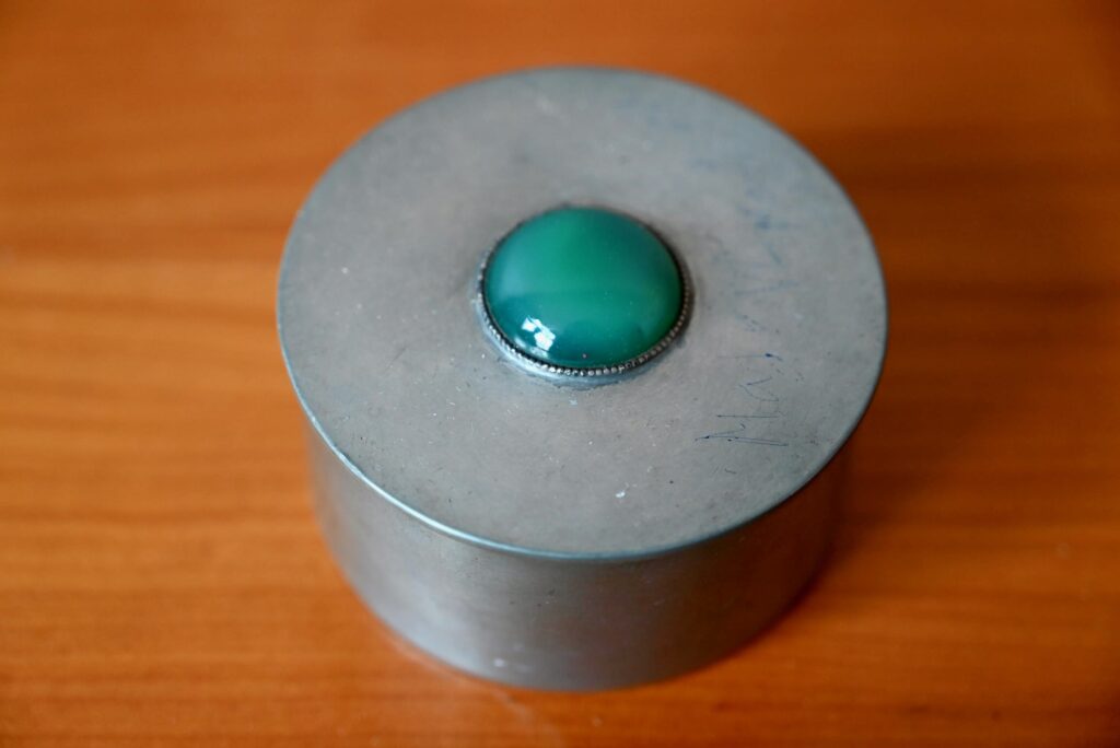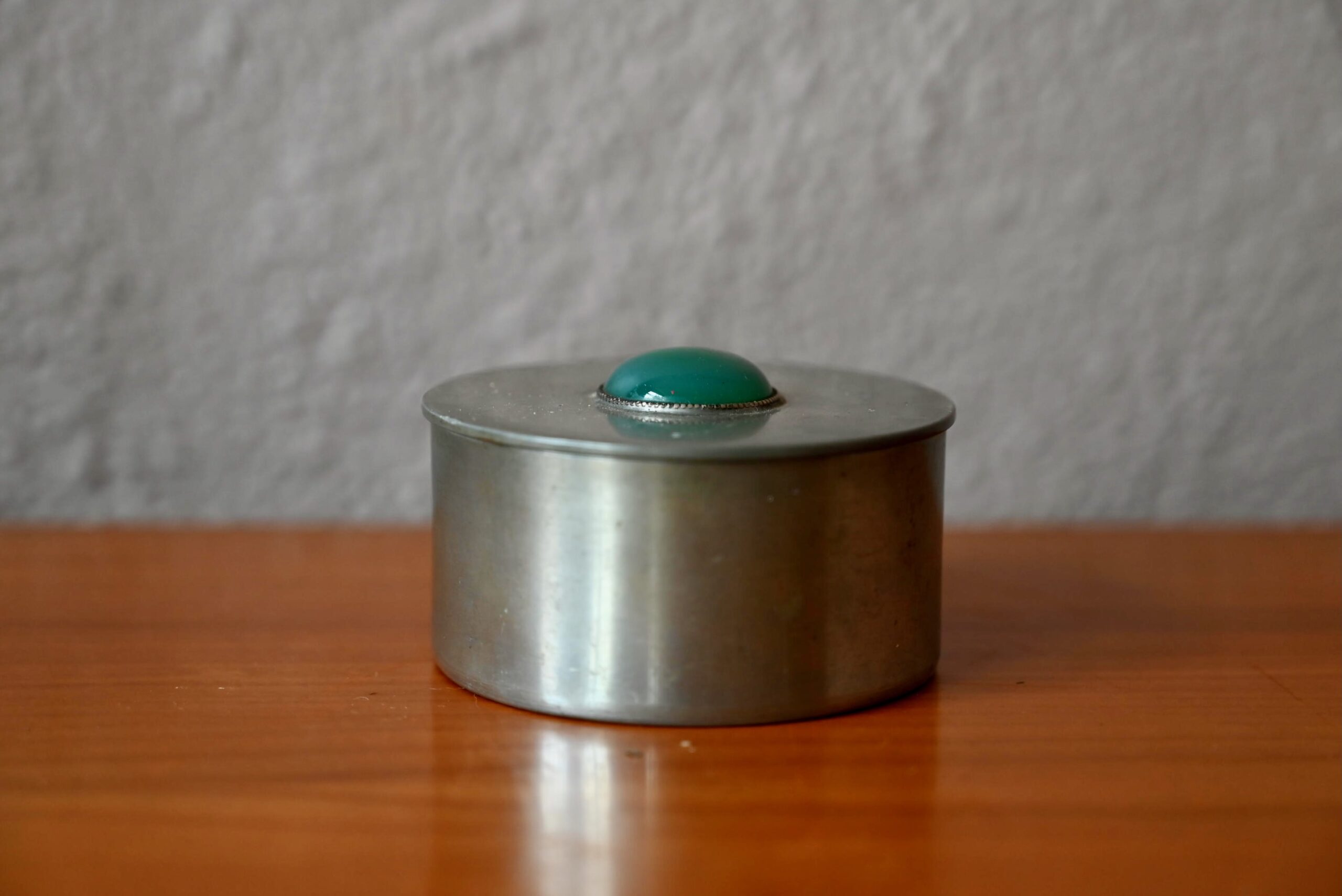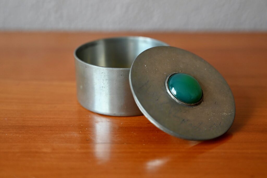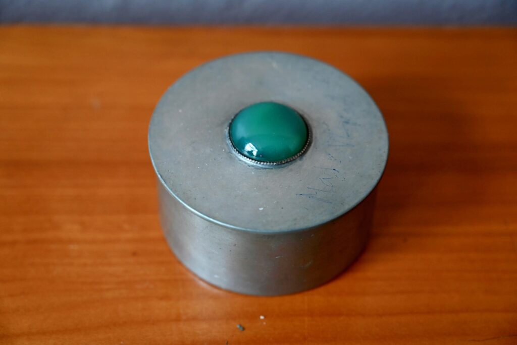 La boite à bijoux date des années 60, elle est en laiton et d’origine danoise. Une jolie pierre verte décore le couvercle. Des traces d’usage sont visibles notamment une petite inscription sur le couvercle. Elle est en bel état.