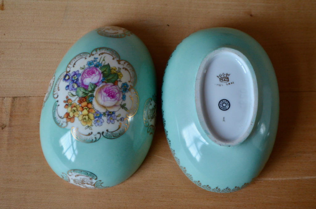 La Manufacture Royale de Saxe fut fondée à Meissen en 1710. Grâce à la qualité et à la finesse de sa porcelaine, elle fut la première manufacture européenne à rivaliser avec les productions chinoises importées à cette période. Les pièces de formes animalières anciennes sont parmi nos préférées et nous craquons pour les oiseaux estampillés Meissen. Cette charmante boîte à bijoux est une production du milieu du 20ème siècle. En forme d’oeuf couché, elle est décorée de fleurs colorées sur un fond vert pâle et or. Production typique de la Manufacture de Meissen, elle est finement ouvragée, et finement décorée. C’est une jolie pièce bohème, attendrissante et délicatement rétro.