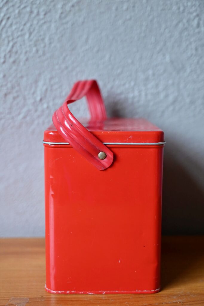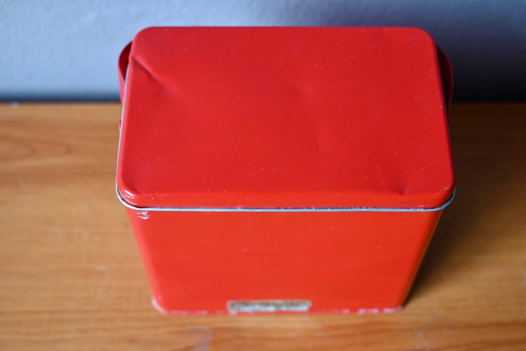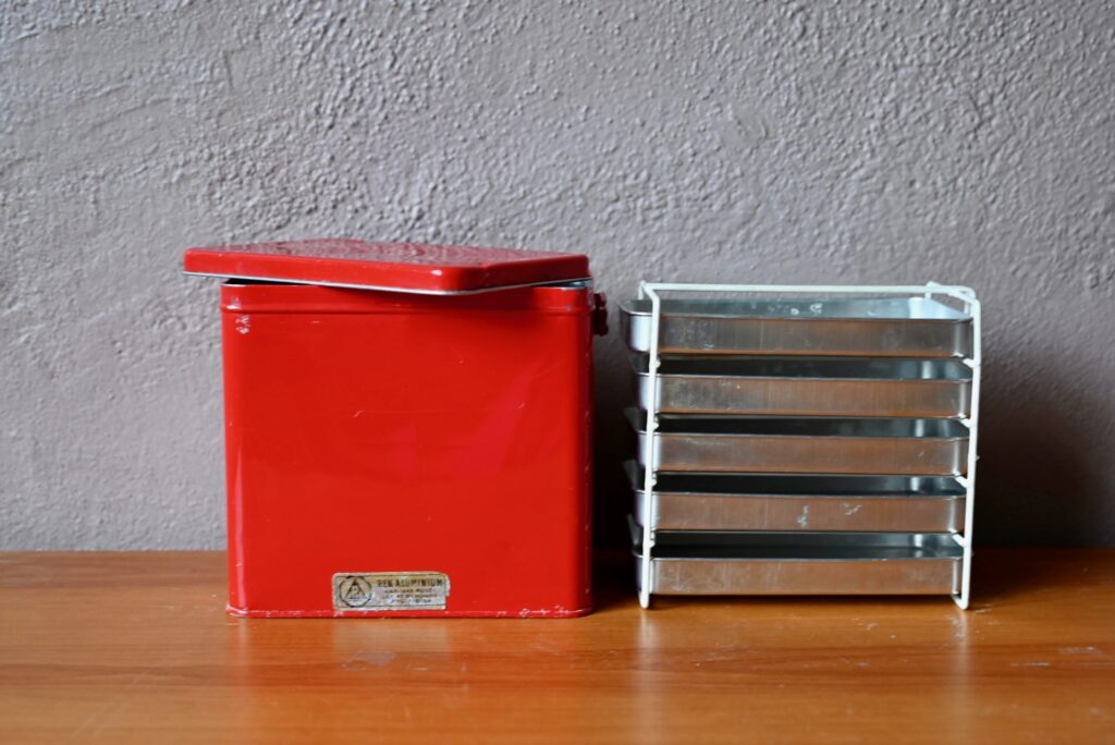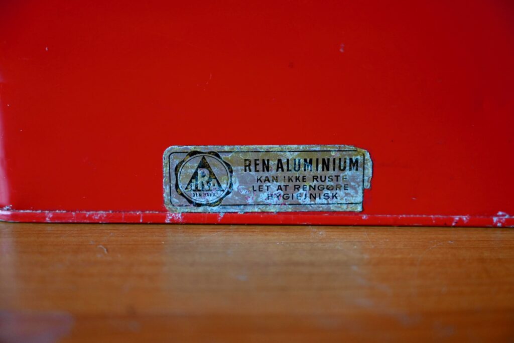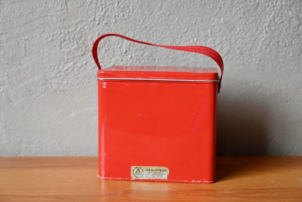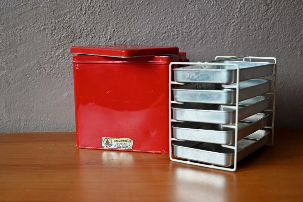 Nous avons fait la découverte de cette curieuse valise en aluminium au Danemark. Il s’agit de la version rétro d’un objet du quotidien que tout le monde connaît bien là bas : la boîte à lunch. 5 plateaux sur support coulissant permettent d’emporter au bureau ou en pique-nique Gudhjemmadyppa, Smørrebrød et autres spécialités scandinaves, et même de régaler les amis au passage! Sa poignée en vinyle épais, et la box en métal rouge nous ont séduits. On aime l’idée de détourner cet objet insolite en boîte à bijoux!