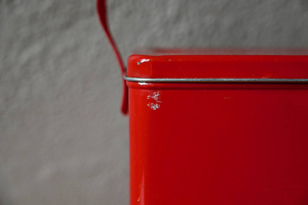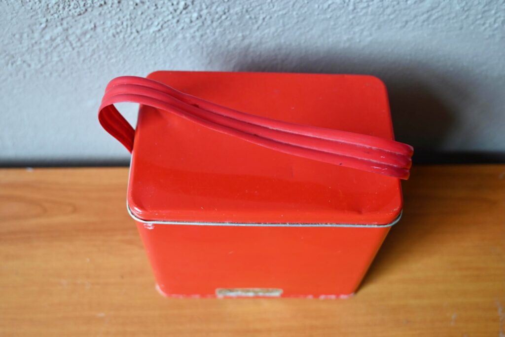 La boîte est en métal peint en rouge vif, elle présente quelques petites rayures et bosses visibles sur les photos. Elle est transportable grâce à une poignée en vinyle épais. A l’intérieur, un système de rayonnage permet de faire coulisser et de sortir 5 plateaux en aluminium. L’ensemble est en bel état.