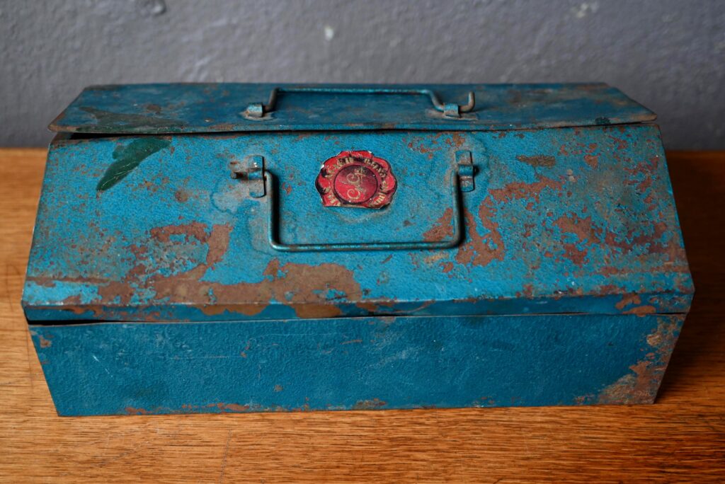 La boîte à outils est en métal bleu métallisé. Les traces et manques de peinture sont nombreux et participent au charme de cette caisse ancienne. Nous avons conservé l’inscription “perceuse” sur un des flancs. La patine du métal évoque un style indus, atelier ou garage. Le coffre a été nettoyé et protégé de l’oxydation, tout en lui conservant tout son jus.