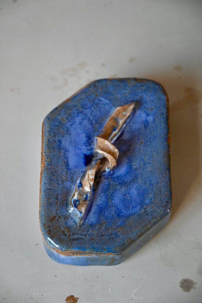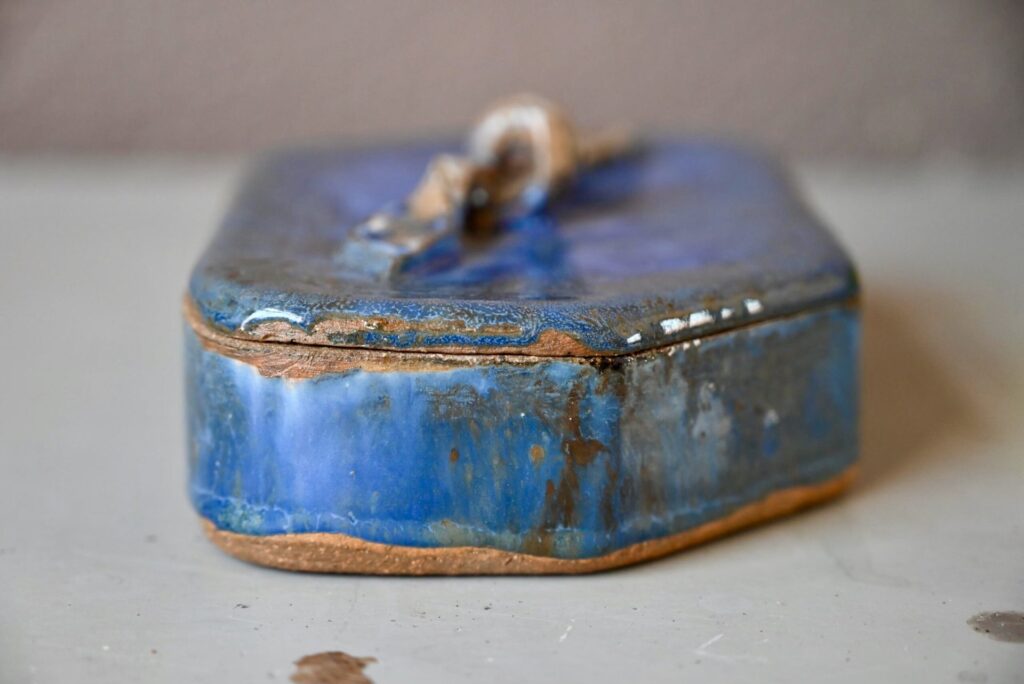 Réalisée en terre cuite irrégulièrement émaillée, cette petite boîte est élégante. On l’imagine bibelot, baguier ou vide-poches. Les nuances de l’émail bleu sont saisissantes et puissantes.