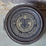 La boîte cylindrique en métal est ancienne, elle est dotée de deux poignées latérales. Son couvercle informe sur sa provenance et sur la nature de la marchandise qu’elle transportait jadis, la typographie est délicieusement rétro. La boîte est en bel état, avec une authentique patine de vie.