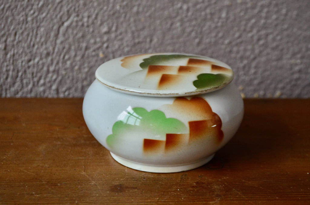Cette jolie bonbonnière en céramique est dotée d’un fin décor géométrique évoquant un paysage de montagne stylisé, et d’une jolie forme toute en rondeur… Production de la faïencerie de Nyon, elle sera parfaite comme petite déco bohème et trouvera sa place sur une coiffeuse Art Déco ou dans une salle de bain rétro.