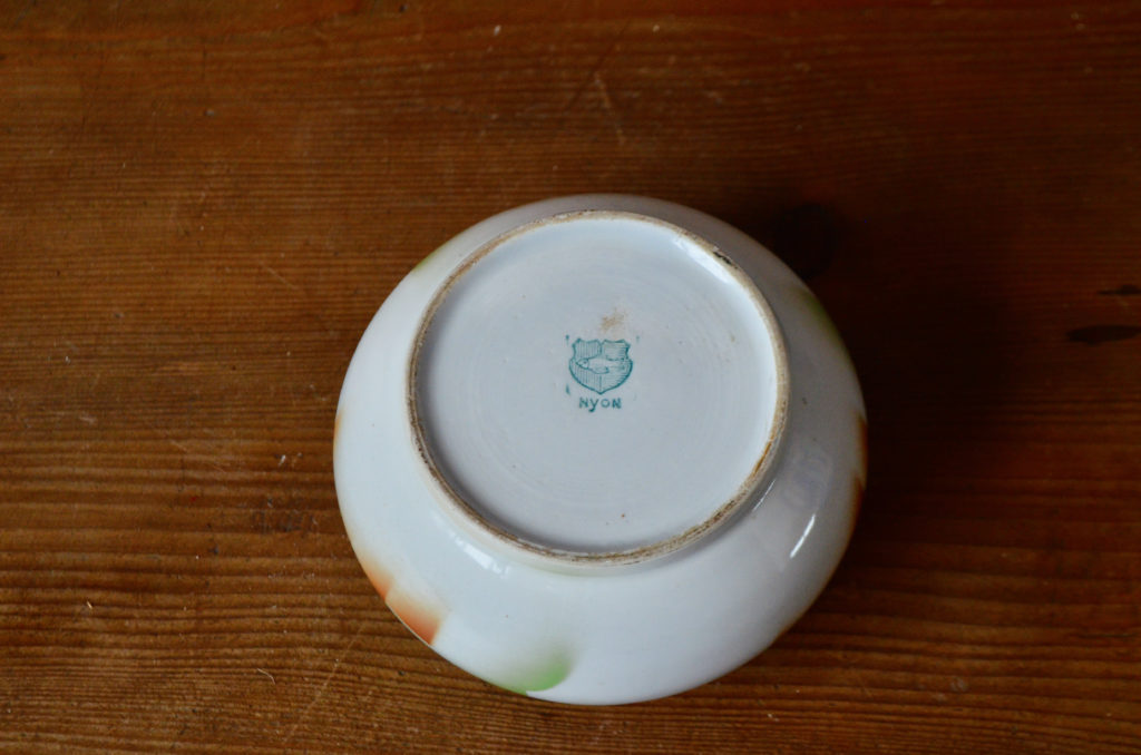 La boîte en céramique est une petite pièce, tout en finesse et élégance. Elle pourra être utilisée en baguier, boîte à bonbons ou à petits mots. Elle date des années 1940, des traces d’usage légères sont visibles, notamment des manques d’email sur la tranche de son couvercle. Elle porte le blason de Nyon sur son envers.