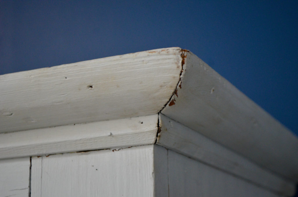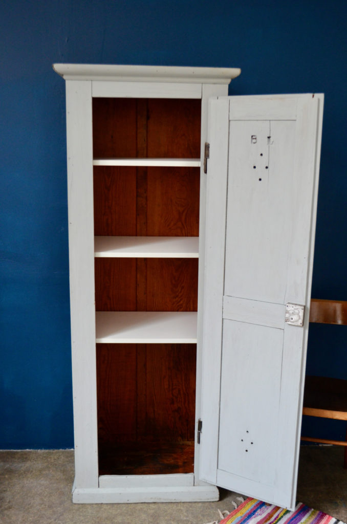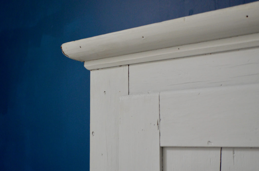La bonnetière est ancienne et date des années 40. Elle est en sapin massif, la peinture gris perle est d’origine. La patine est belle et raconte sa vie d’atelier. Des traces d’usage et d’anciennes marques d’eau sont présentes, notamment en bas côté droit. Il manque une portion de baguette moulurée sur ce même côté, visible en photos. L’entrée, serrure et clef sont d’origine. Le meuble est sain, dans un format vestiaire et a été entièrement nettoyé. L’intérieur est composé d’étagères lessivables. Le meuble est en très bel état.