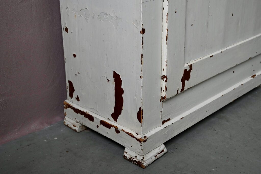 L’armoire est en bois massif, de très belle facture. Sa peinture brillante blanc cassé est d’origine, joliment patinée. Des marques d’usage sont visibles. L’intérieur dispose d’étagères. Serrure et clef sont d’origine. Très propre, la bonnetière est stable, lourde et en bel état.