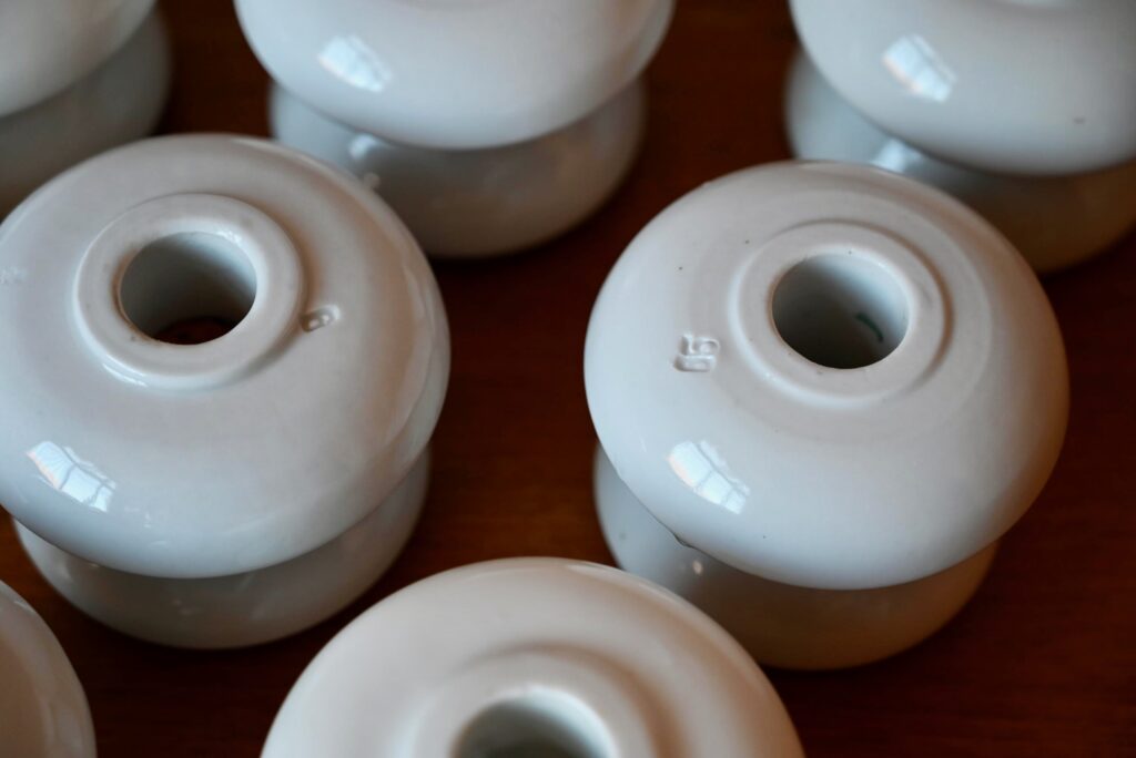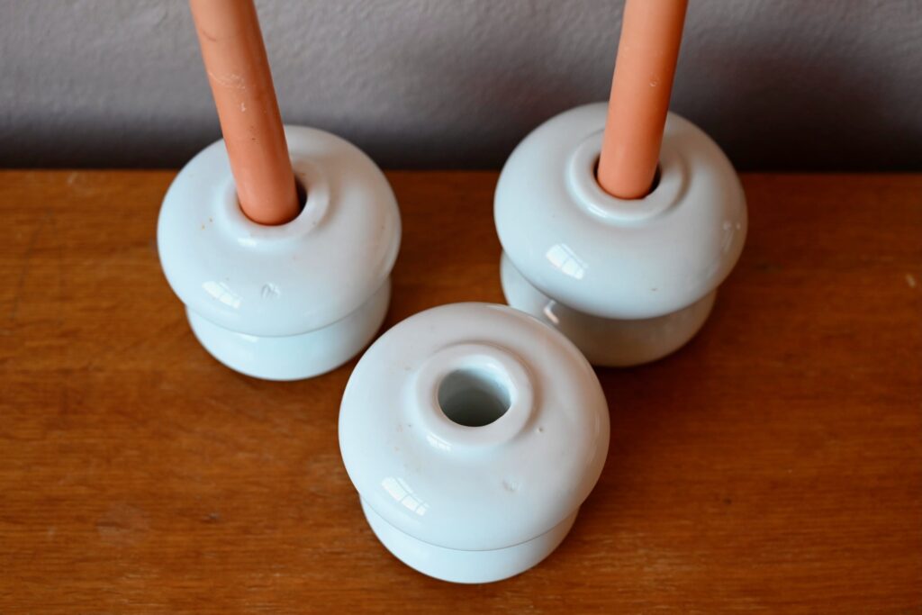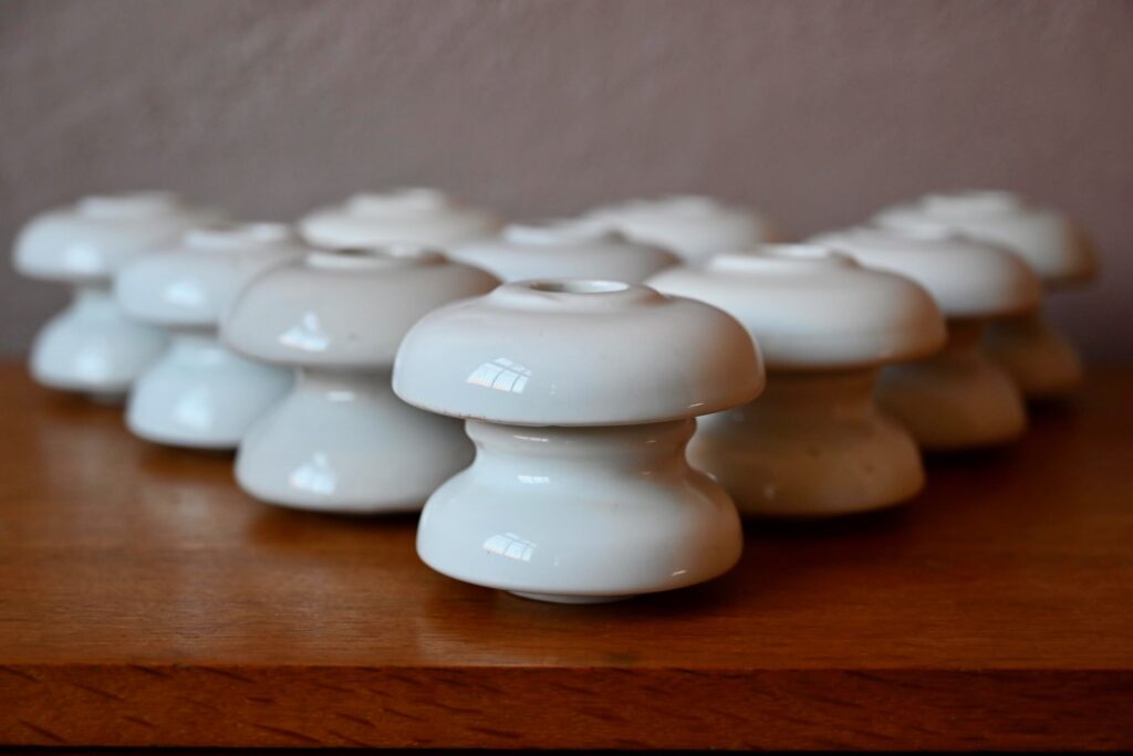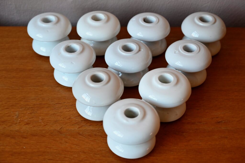 Anciens isolateurs électriques en porcelaine, nous les imaginons bougeoir ou presse-papier. Ils sont tous en bel état et proviennent du Danemark. Nous disposons de 10 pièces.