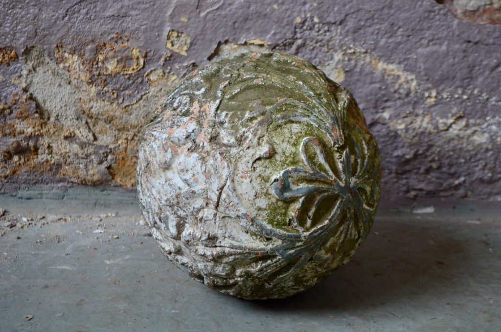 La boule de jardin est en pierre reconstituée, elle est creuse. Laissée dans son jus, elle est patinée par le temps.