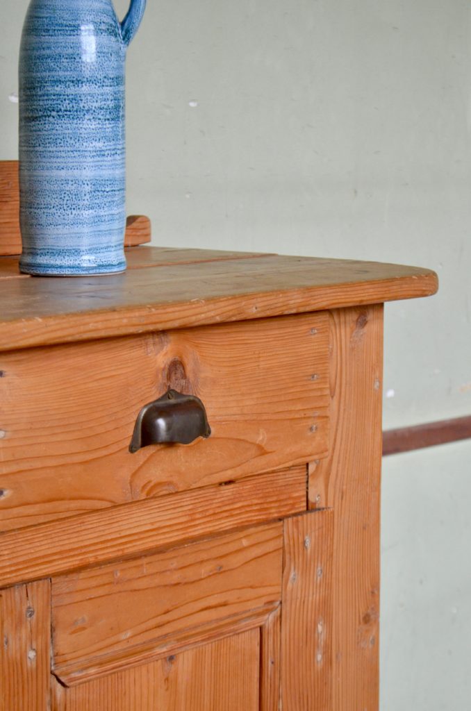 Meuble bohème par excellence, ce buffet en sapin des années 40 est plein de charme. Ses lignes sont douces et harmonieuses. Petit vaisselier dans une cuisine de campagne, meuble d’entrée rustique, commode dans une salle de bain ou une chambre bohème, ce meuble tout en bois est chaleureux. Nous aimons beaucoup son lustre, sa teinte miel et le joli dessin des pieds et du rebord arrière du plateau…