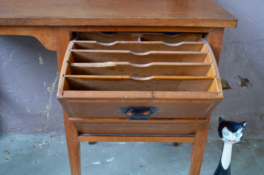 Ce chouette bureau des années 50 cache bien son jeu… Allure sobre et élégante, ce bureau rétro a fait carrière dans une administration. Nous aimons ses proportions idéales pour un premier bureau de grand, sa conception tout bois durable et intemporelle, sa poignée coquille facile à attraper, sa tablette latérale escamotable et… tadam.. l’ouverture surprenante du caisson! Son double tiroir cache en réalité un somptueux trieur en bois qui se déploie comme par magie! Pour la paperasse des grands ou pour les cahiers et albums de coloriage des plus petits, ce bureau vintage est original et bien pratique!
