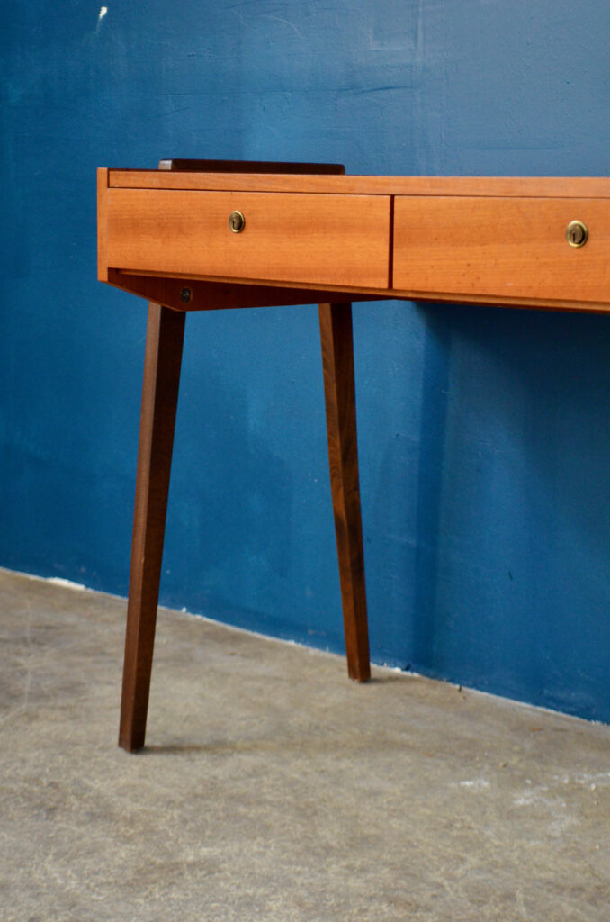 Le bureau est ancien et date des années 70. Il est en bois et placage bois. Le caisson comporte un vaste plateau en mélaminé bois doré et deux tiroirs. Nous ne disposons plus des clefs, les poignées sont intégrées. Il est porté par un piétement compas impressionnant à la teinte contrastée. L’ensemble est stable, en bel état. Les caches-vis sont manquants sur le piétement, mais cela ne nuit pas à l’esthétique du meuble. Bureau adapté dès 8ans.