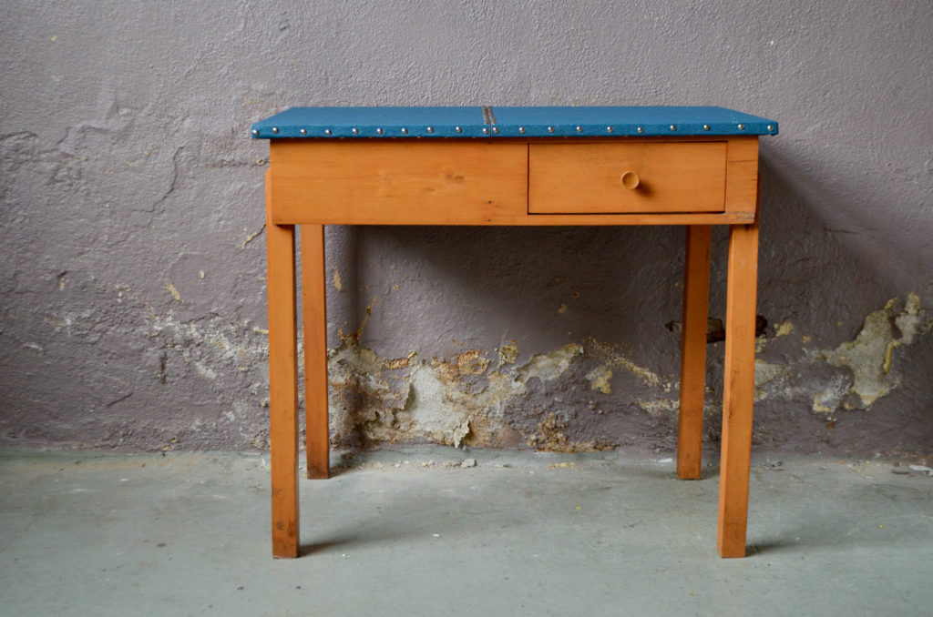 D’une tendresse folle, ce petit bureau des années 50 est très attachant! Doux secrétaire, les lignes sont simples et intemporelles. La teinte dorée du piétement en bois est chaleureuse et contraste merveilleusement avec le vinyle bleu du plateau. Le pourtour de ce dernier est clouté, venant donner un petit coup de fouet à ce bureau-coiffeuse à l’allure sage. Un tiroir adorable et un “coffre” sous le battant à miroir complètent les atouts de ce joli bureau rétro… Que ce soit pour se pomponner, bricoler ou travailler depuis chez soi, ce charmant bureau nous aidera à mettre du coeur à l’ouvrage, c’est certain!