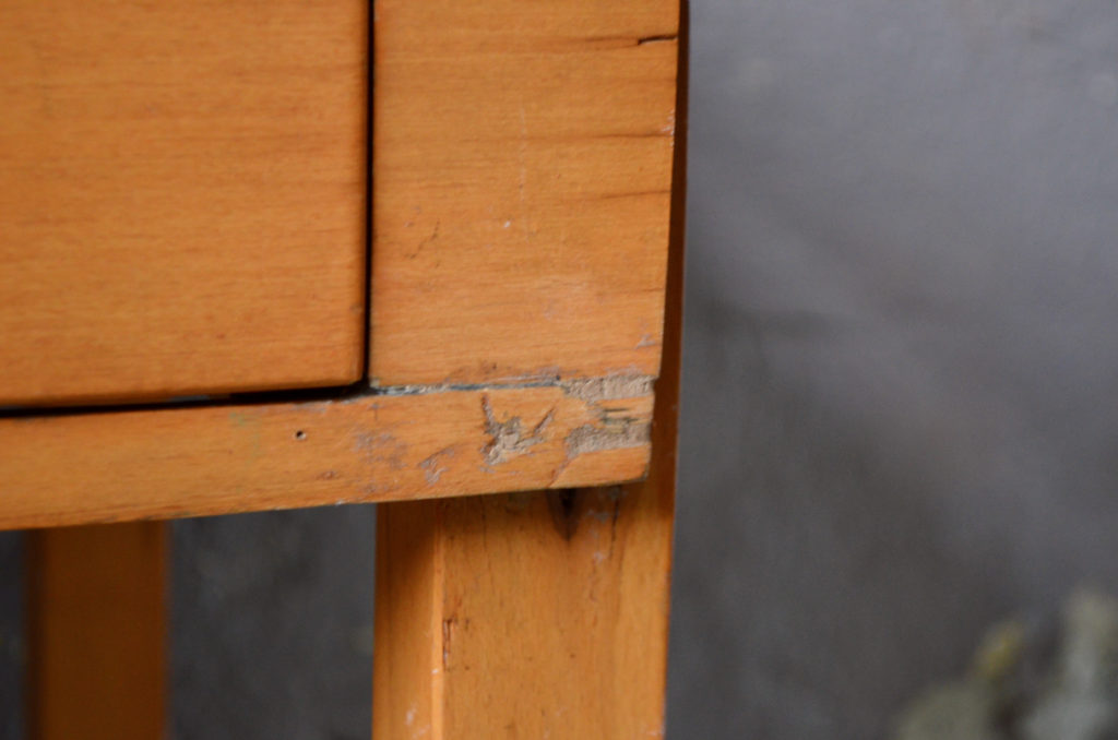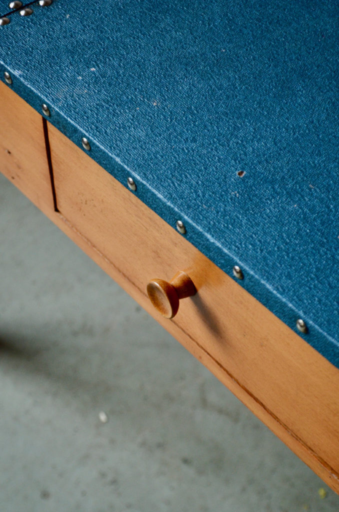Ce bureau des années 50 est ancien et en très bel état. Le piétement est en bois massif d’une belle teinte blonde. Le plateau est couvert d’un vinyle texturé d’origine, d’une teinte bleu. Il est clouté. Quelques taches et petits trous discrets sont visibles en photo. Un tiroir avec son petit bouton en bois tournée, et un caisson fermé par un battant du plateau abrite un rangement et un miroir. Une petite réparation ancienne est visible en photo, sur le haut d’un pied. L’ensemble est en très bel état, stable et très pratique.