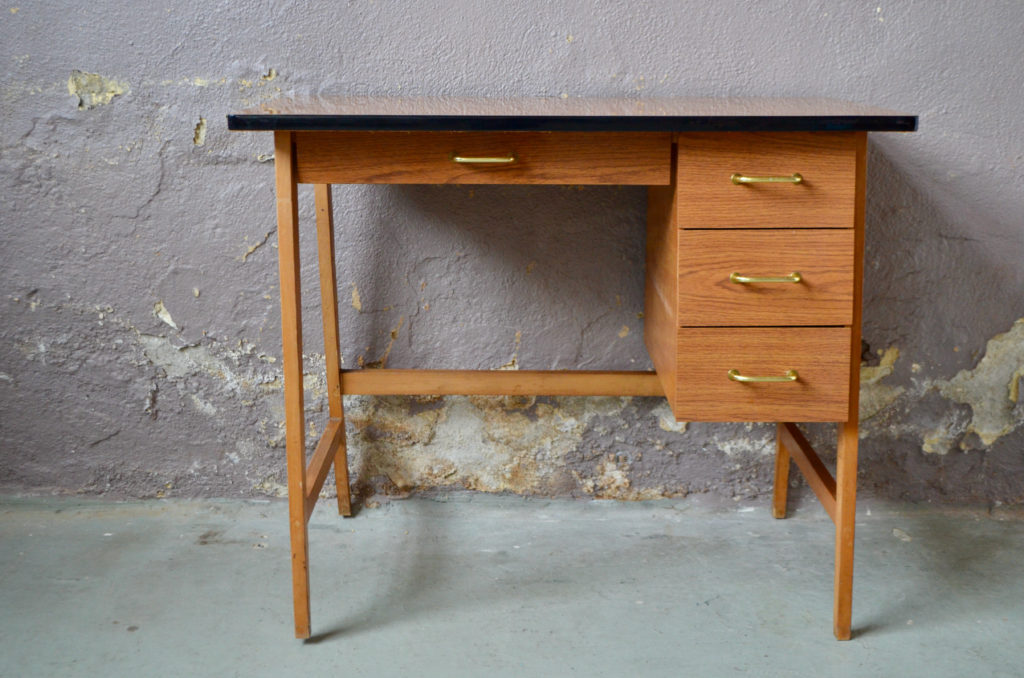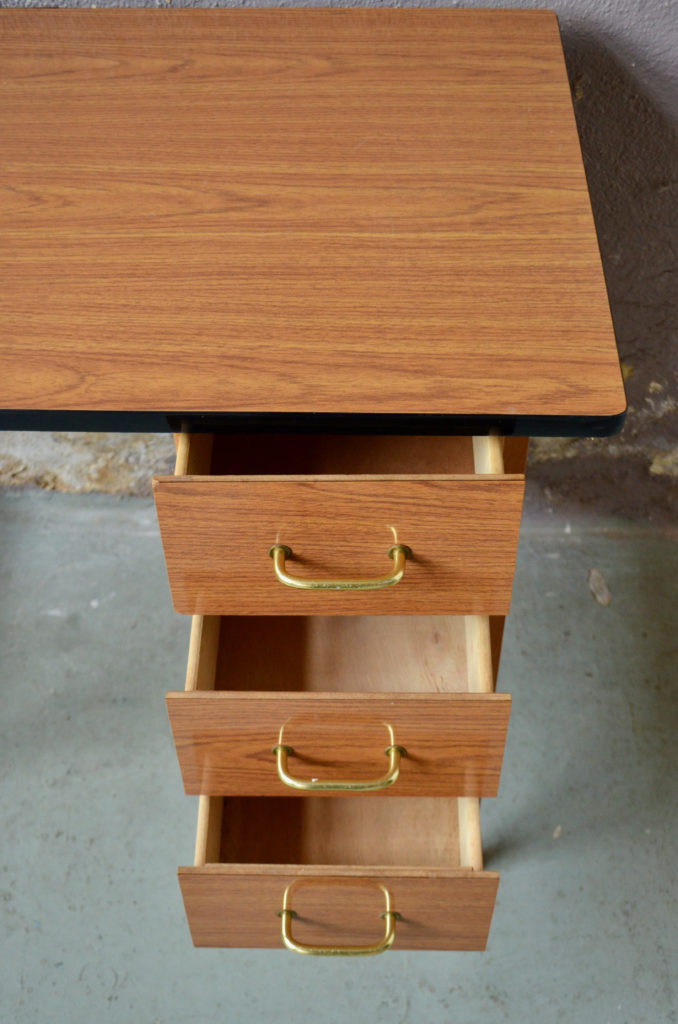 Le bureau est de style scandinave. Il date des années 60 et présente un joli piétement compas. Il dispose d’un plateau en mélaminé imitation bois (tout comme les façades de tiroirs). Quelques traces d’usage sont visibles. Niveau rangement, il comprend 3 tiroirs aux poignées de laiton. Le bureau est stable, en bel état.