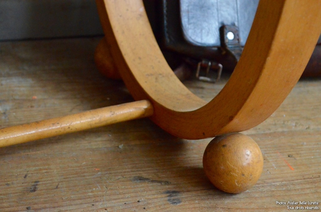 Nous n’avions encore jamais vu de pareil pupitre! Montants “arceaux”, arrondis à la manière d’une lyre, le petit bureau en bois semble en équilibre précaire, calé grâce à un piétement boule. Beaucoup de poésie et un brin de magie animent cette pièce rétro unique en son genre! Edité par Simbag dans les années 60, le bureau ravira le petit dès 18 mois et deviendra par la suite un chevet au look bien trempé!