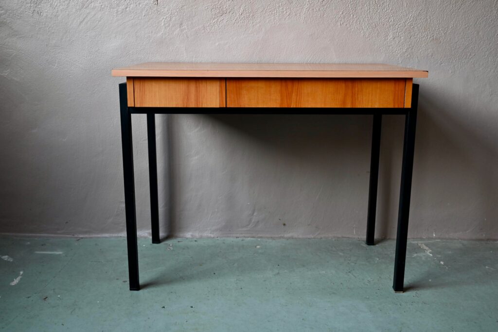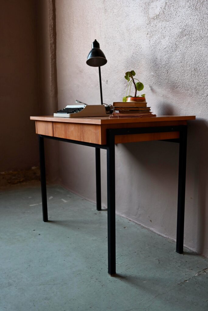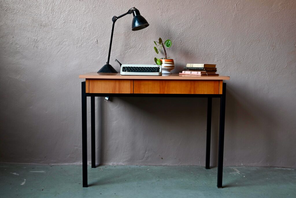 Ce bureau rétro tout en finesse et légèreté séduit par sa simplicité et ses jolies manières. L’association du mélaminé à la teinte chaleureuse et du métal traité avec finesse est harmonieuse et intemporelle. Les lignes modernistes de ce bureau vintage sont minimalistes, et pourtant, toues les critères pour en faire une parfaite table d’études sont réunis : grand plateau, tiroir et bel espace pour y glisser un confortable fauteuil. Associé à une lampe pimpante, ce joli meuble des années 60 conviendra à tous, sans limite d’âge.