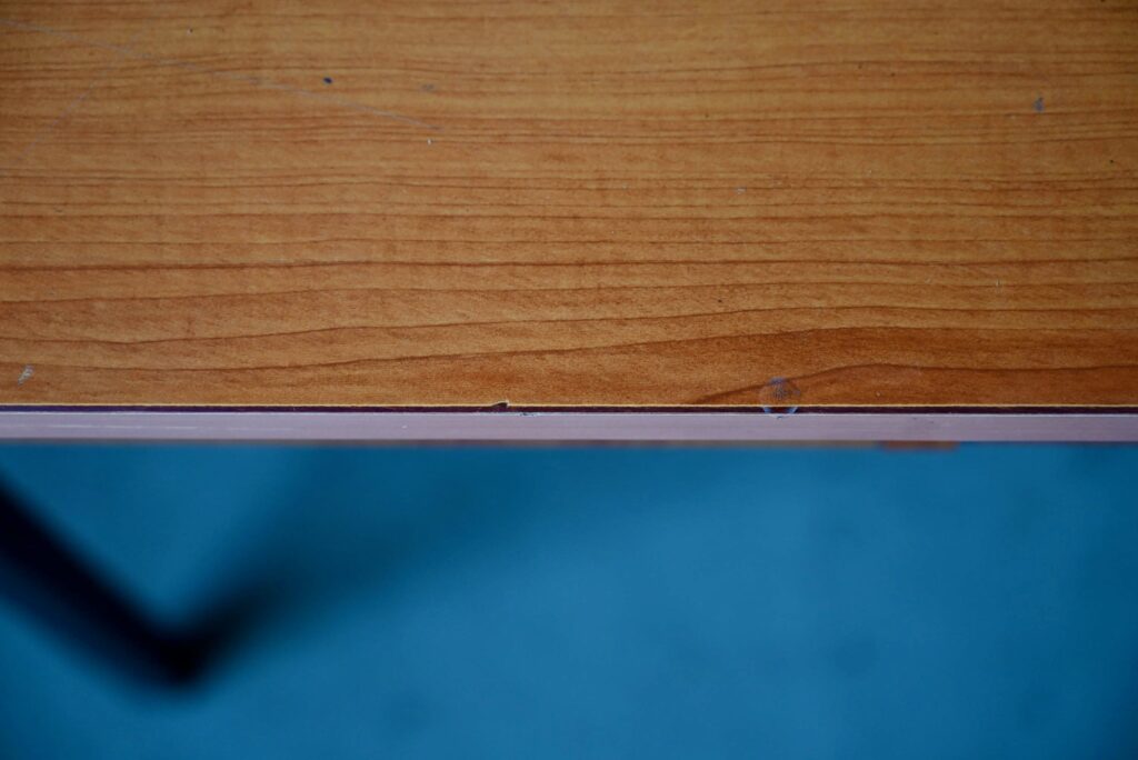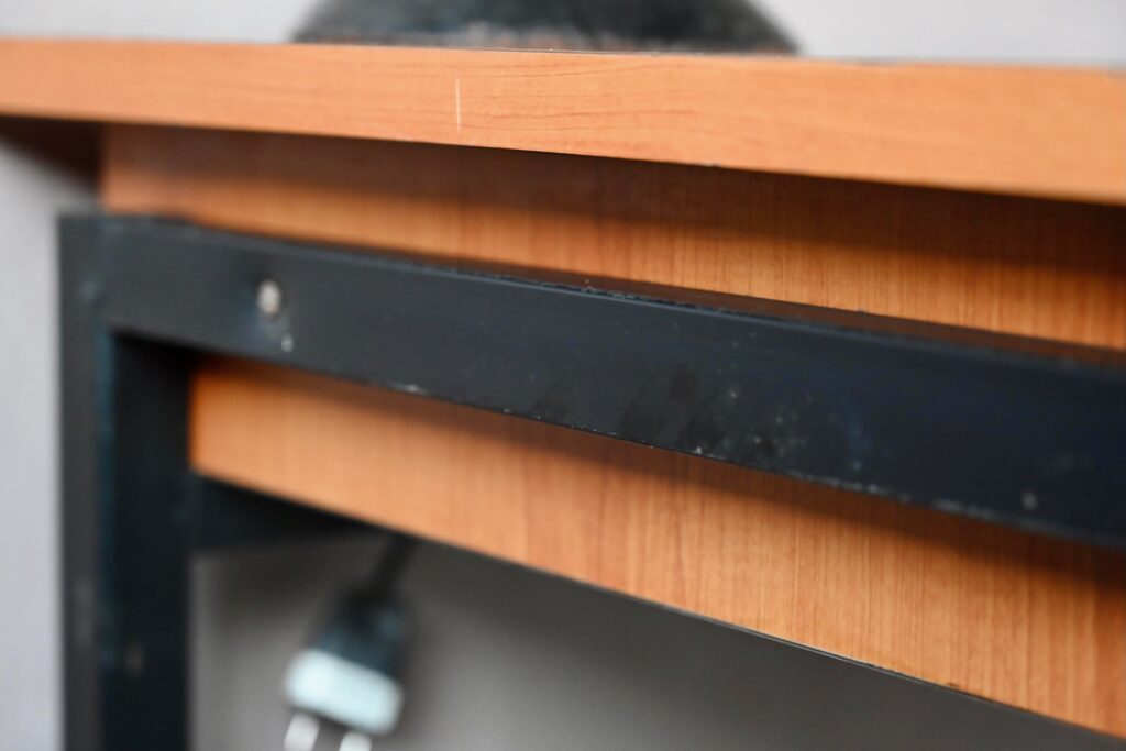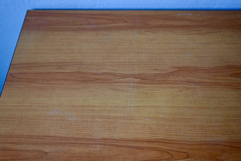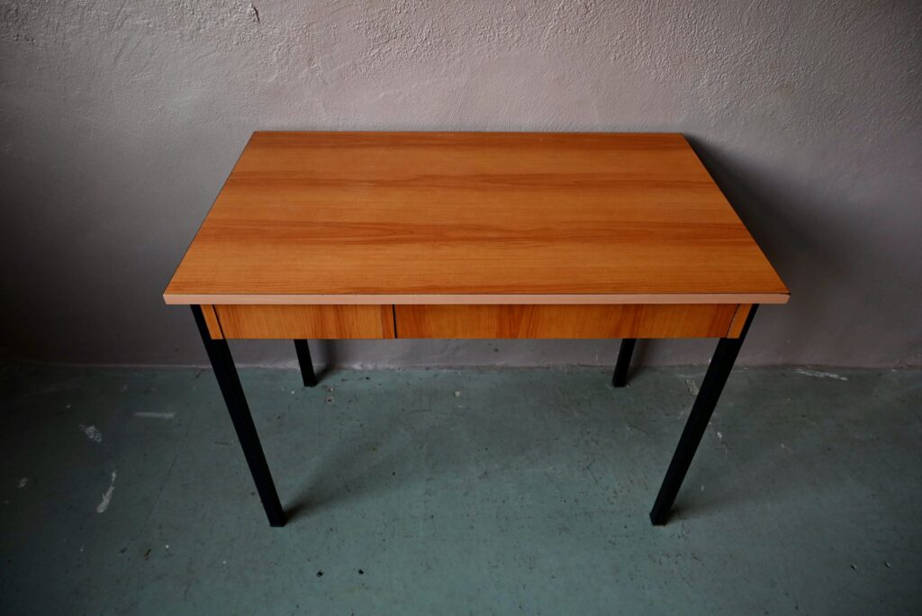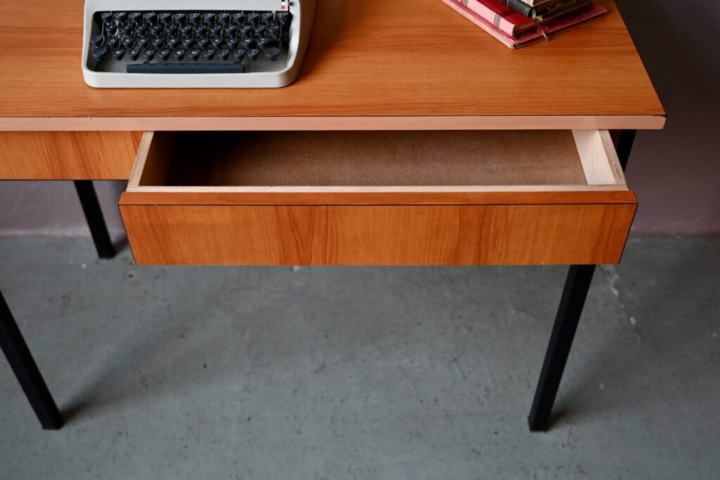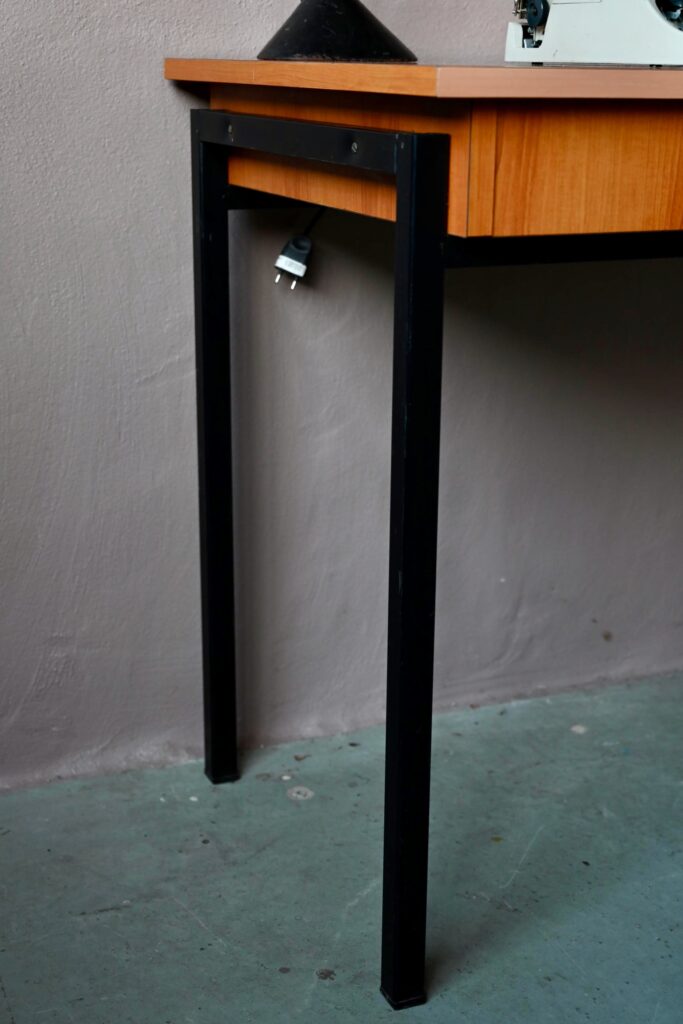 Le bureau est ancien et date des années 60. Il est en placage de mélamiané imitation teck, d’une teinte miel chaleureuse. Plateau et caisson sont soutenus par un piétement tubulaire de section carrée en métal noir. Il présente quelques traces d’usage et oxydation, visibles en photo. Le bureau dispose d’un tiroir. L’ensemble est stable, harmonieux et en bel état. De petits manques de chant sont à noter visibles sur une photo. Des rayures et quelques taches d’usage sont à noter sur le plateau.