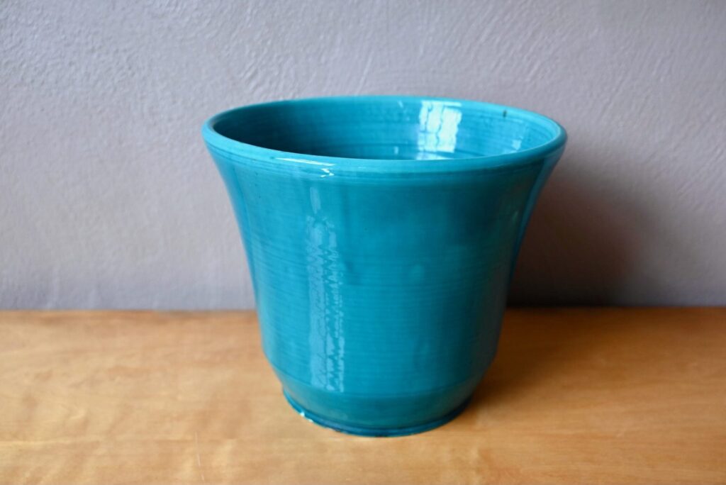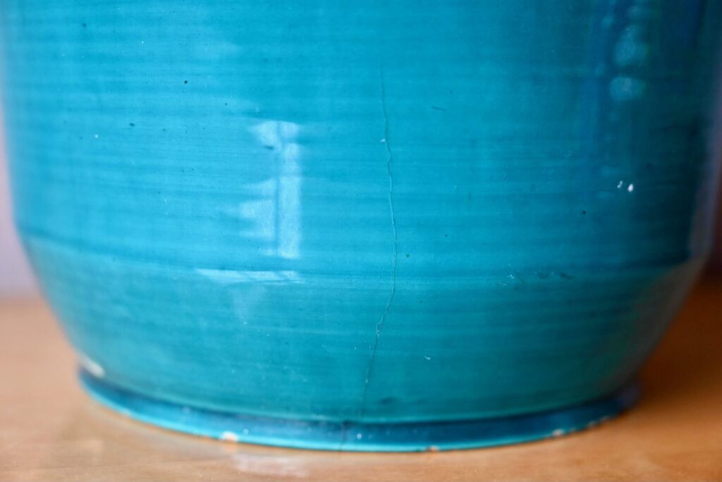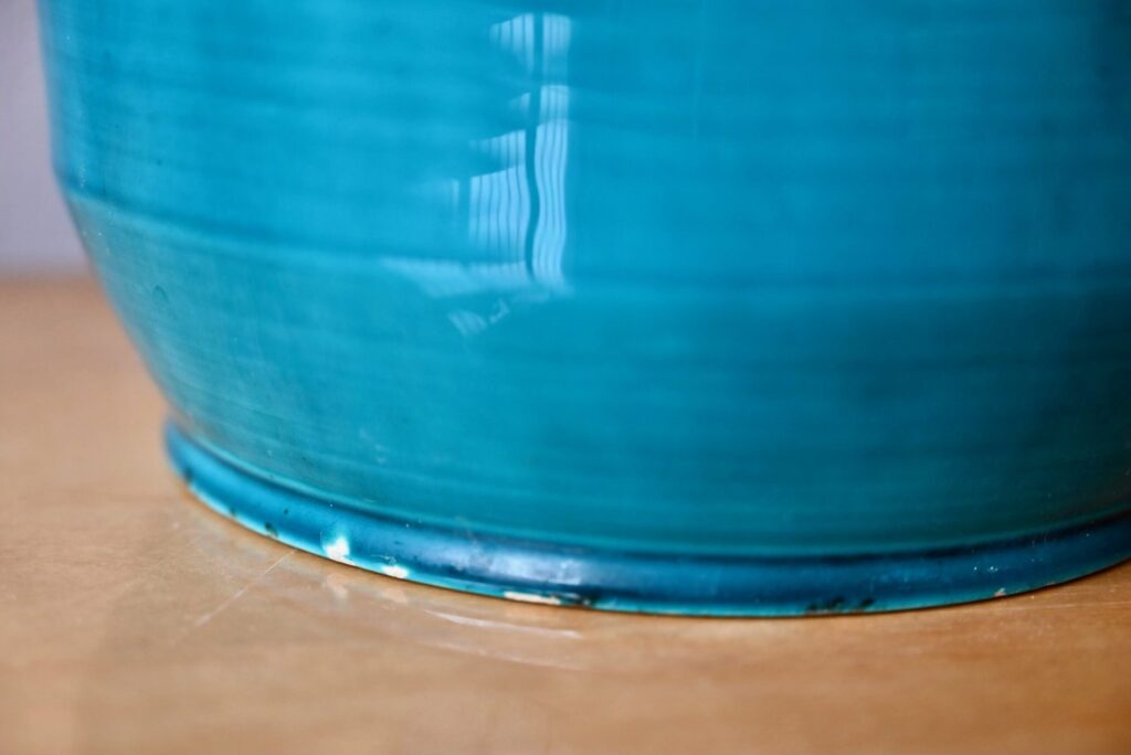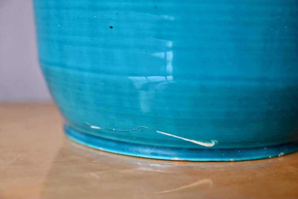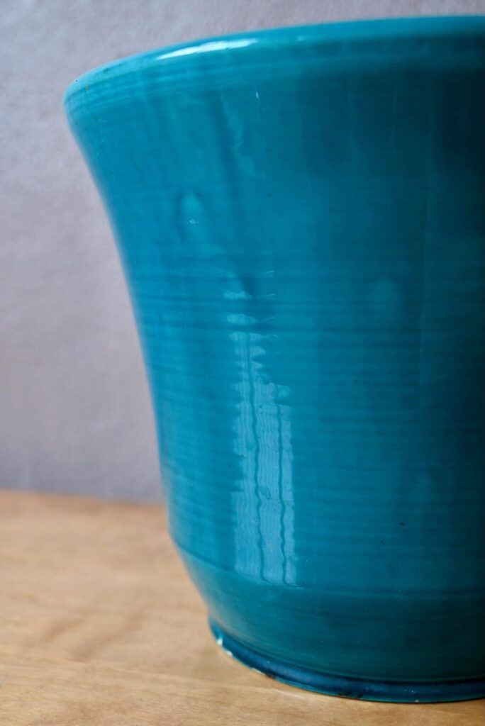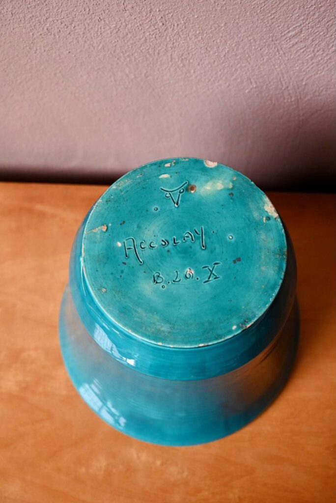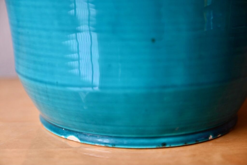 Le cache-pot des potiers d’Accolay est en céramique, il est ancien. La transparence de l’émail bleu paon apporte de la profondeur à la pièce. Celle-ci présente plusieurs petits défauts visibles en photo : petits éclats sur la base, défaut de cuisson, fissure de l’émail. Il n’y a pas de fête de la matière. Il est signé à sa base.