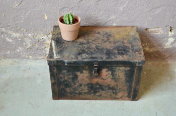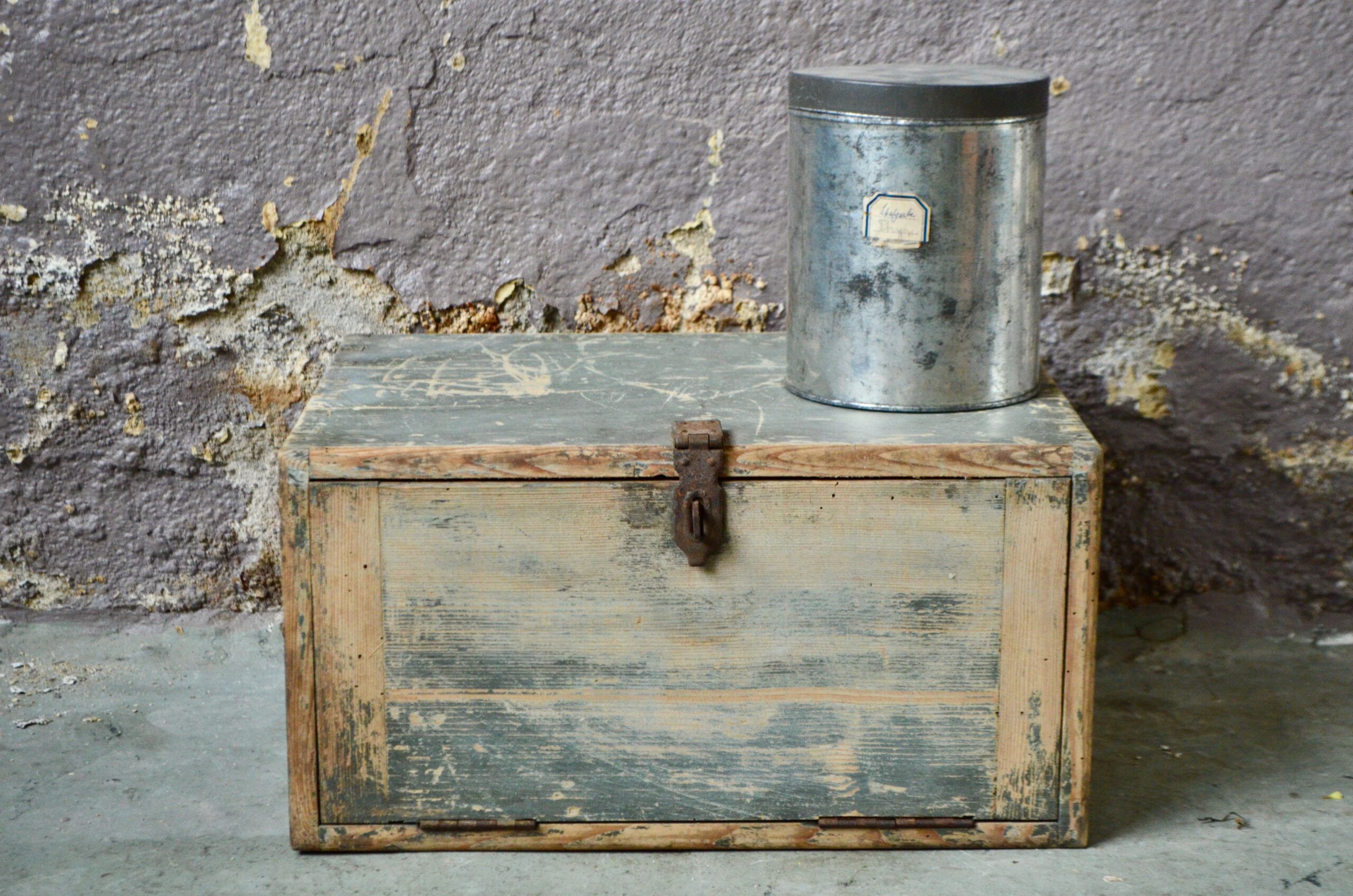 La malle est en bois massif. Elle est très ancienne. La peinture d’origine orange est très patiné et a beaucoup de charme. L’ensemble est sain et en bel état. Des poignées et des loquets fonctionnels sont présents.