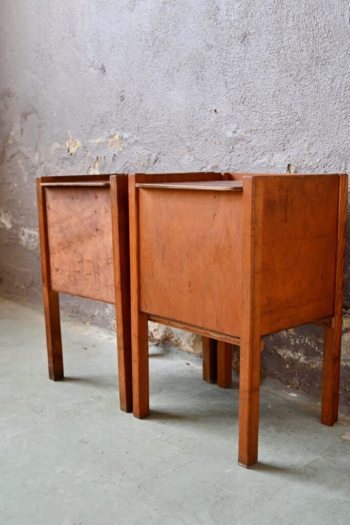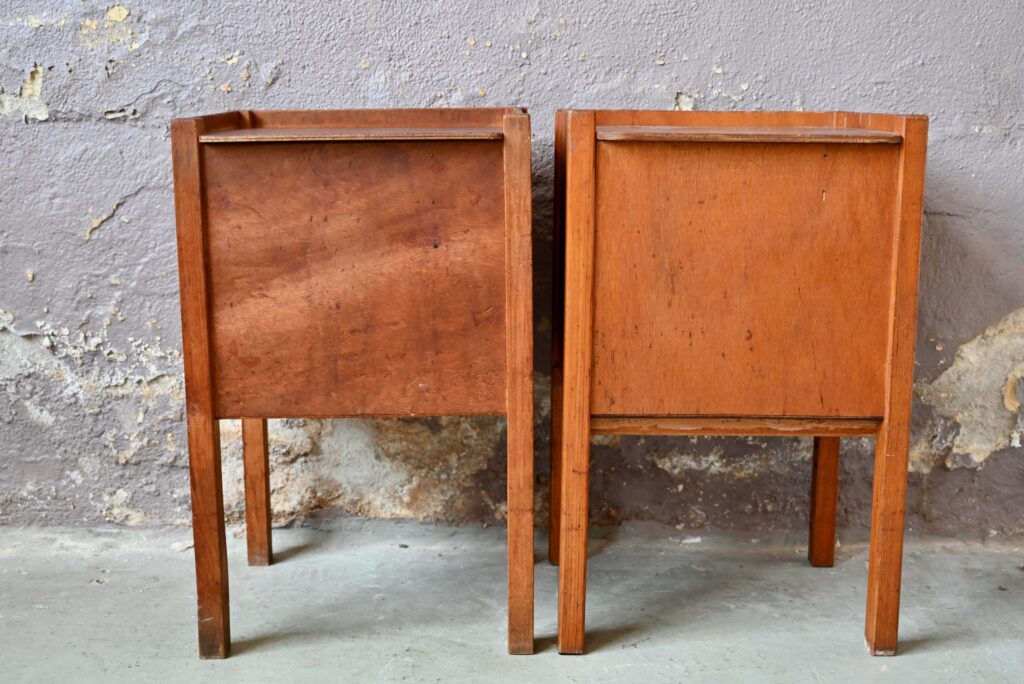 Ces petits meubles à caisson sur pieds servaient de rangement pour les ouvrières d’une fabrique alsacienne de soutien-gorges. Elles pouvaient y entreposer leur effets personnels ainsi que du petit matériel de couture et de confection. De fabrication simple et sommaire, ils sont fabriqués en bois et contreplaqué. Le plateau du caisson est amovible, il dissimule un espace de rangement et servait également de petit plan de travail. Meubles touchants de vécu, ils trouveront place dans nos intérieurs modernes comme chevet, meubles à chaussures, sellette ou porte-plantes et raconteront encore longtemps l’histoire de ces courageuses petites mains.