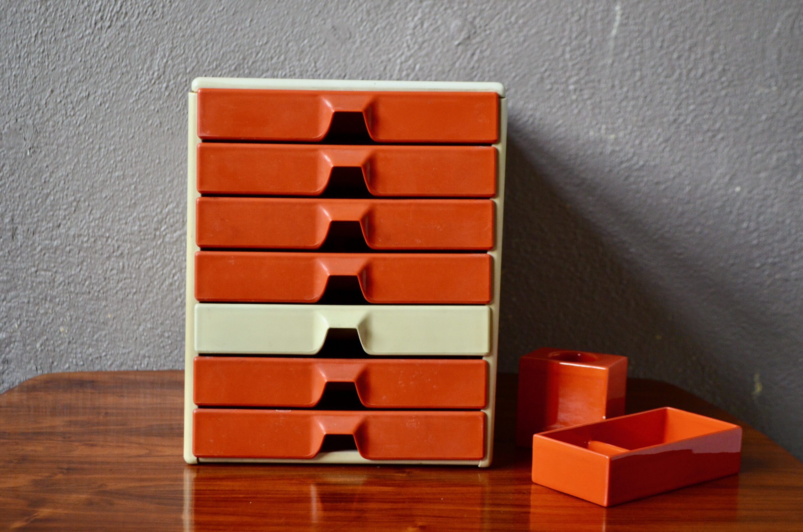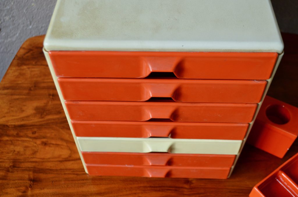 Ce petit meuble de rangement au style indubitablement vintage date des années 60. Ses nombreux tiroirs crème ou orange pop devaient permettre une organisation parfaite pour y archiver papiers et documents. Sur le bureau ou dans une étagère, il rendra service et facilitera le classement avec style!