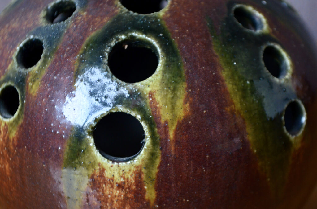 Cette charmante céramique est un pique-fleurs signé des Potiers d’Accolay. Originale, attachante et réalisée avec subtilité, nous apprécions sa forme “boule”, servie par un joli travail d’émaillage aux reflets métalliques dans un esprit “brut de four”. Ce charmant petit vase se prêtera à toutes les compositions ikebana, florales et décoratives.