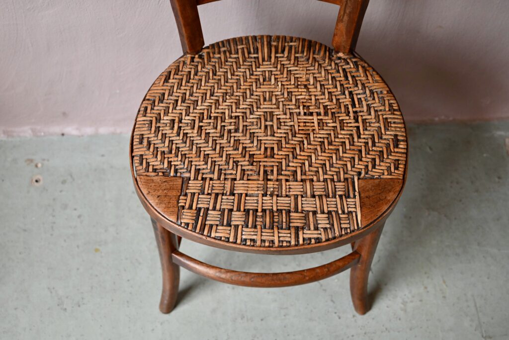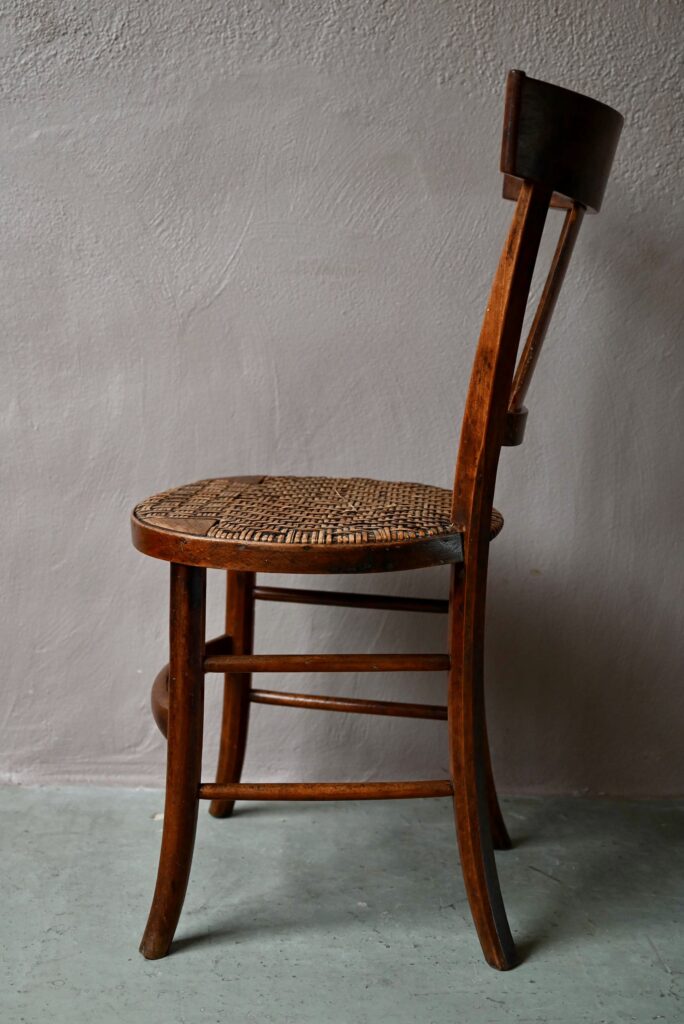 La chaise est de belle fabrication. Elle est en noyer, joliment sculptée et cannée. Elle date du début du 20ème siècle. Elle est patinée et en bel état. Des discrètes traces d’usage sont à noter sur le bois, un petit manque de placage sur le médaillon dossier et des rares manques de cannage.