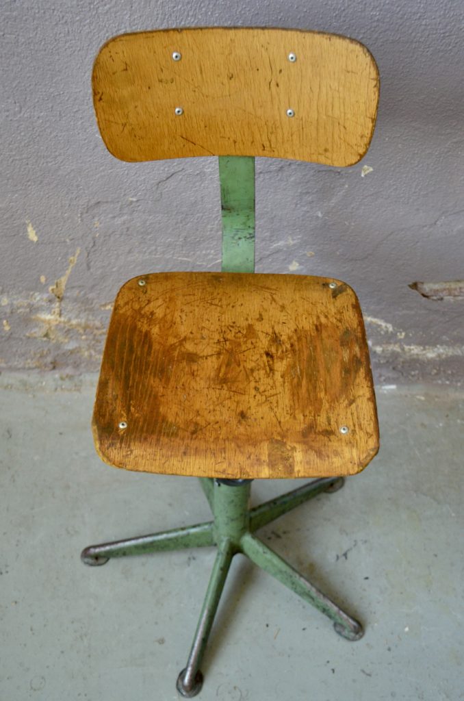 La chaise industrielle a été utilisée avec intensité, elle possède de belles marques d’usage. Elle date des années 50 et est parfaitement fonctionnelle. Elle est réglable en hauteur.