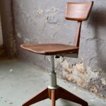 Piétement, assise et dossier sont en bois massif, d’une teinte chaleureuse et patinée avec douceur. La chaise de bureau Stoll est en bel état, patinée par l’usage. La chaise est stable et confortable. La hauteur et la profondeur de dossier sont réglables.