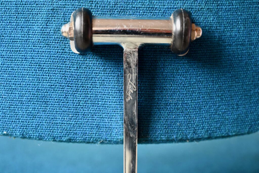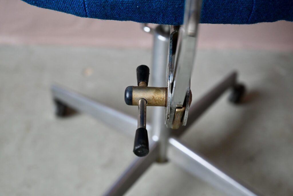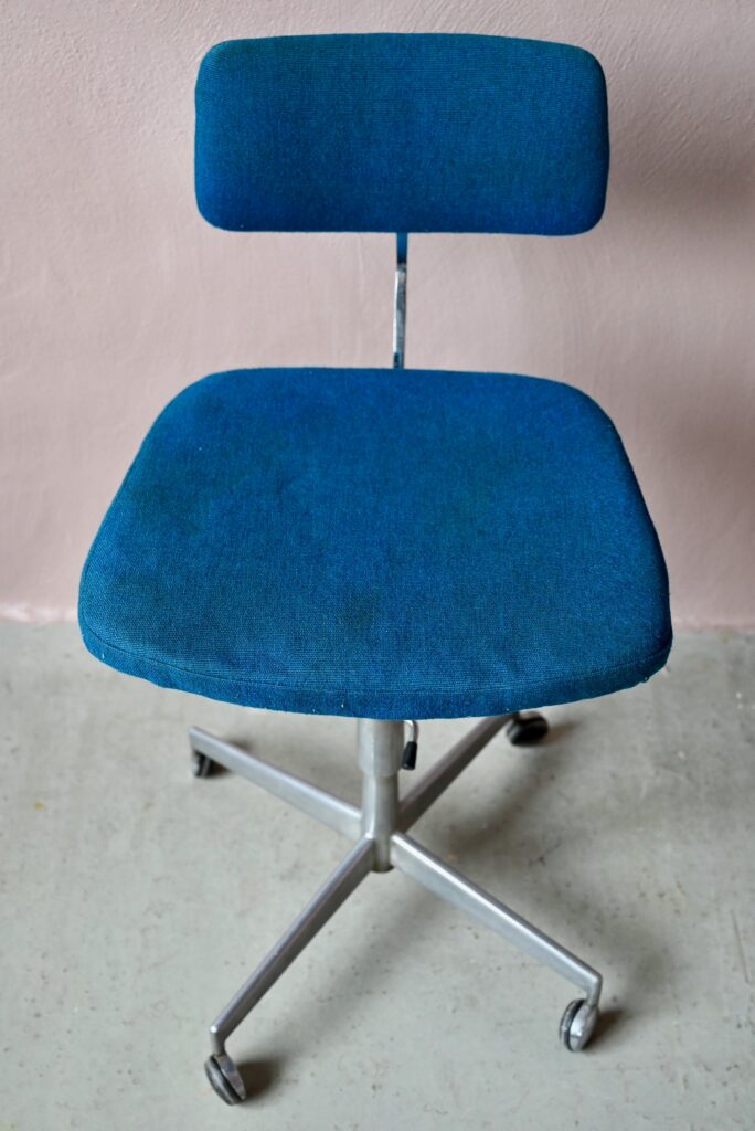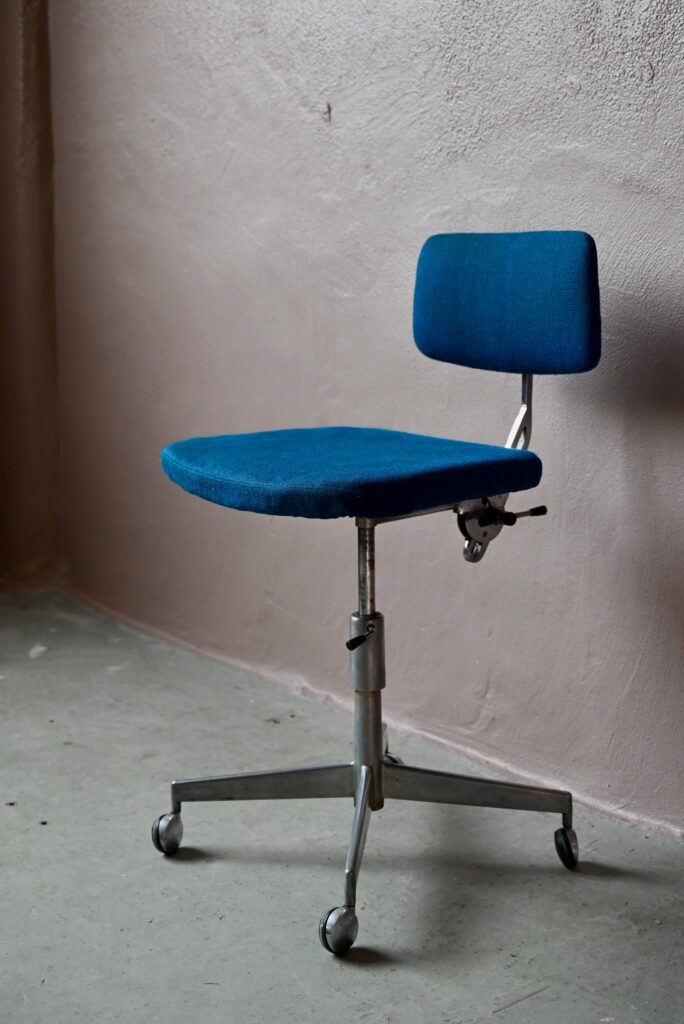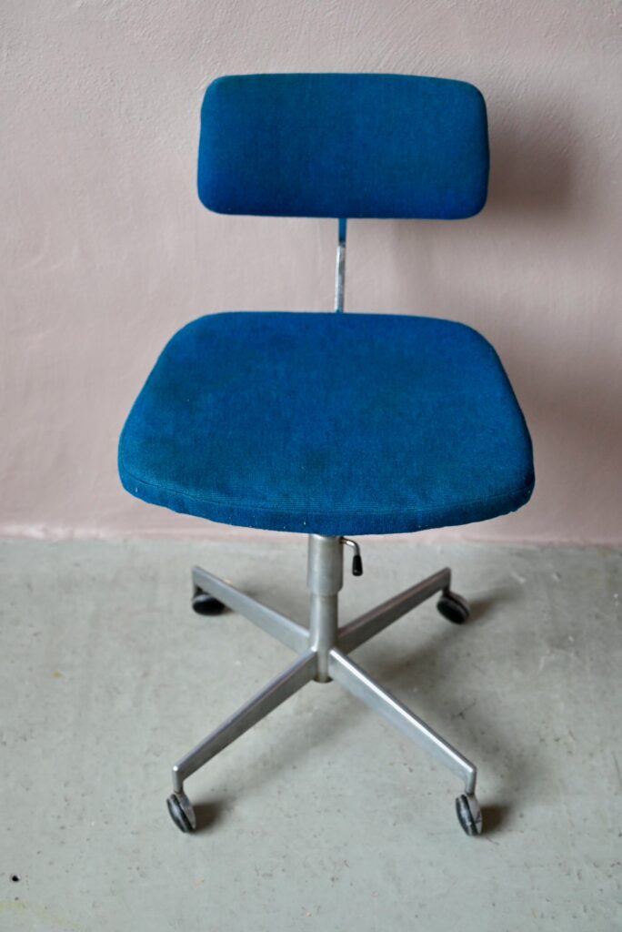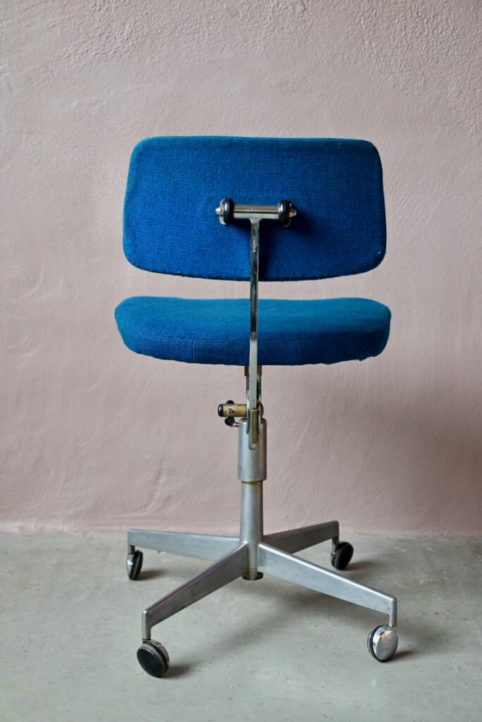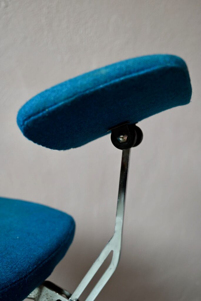 La chaise de bureau date des années 60. Elle a été éditée par la firme danoise Labofa. Son piétement étoile chromé comporte des roulettes. Assise et dossier comportent le tissu bleu d’origine. Il a été nettoyé, une discrète auréole demeure. La structure de la chaise est en chrome, des traces d’oxydation y sont visibles. La chaise pivote et est également réglable en hauteur. Un système de réglage permet aussi de régler la profondeur du dossier. La chaise de bureau offre une belle ergonomie.