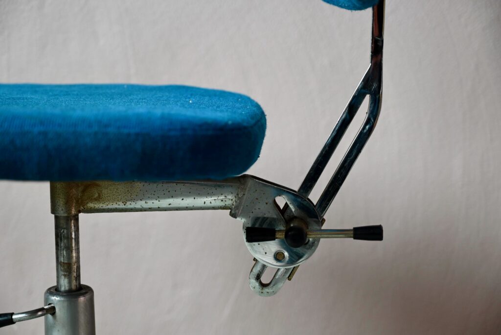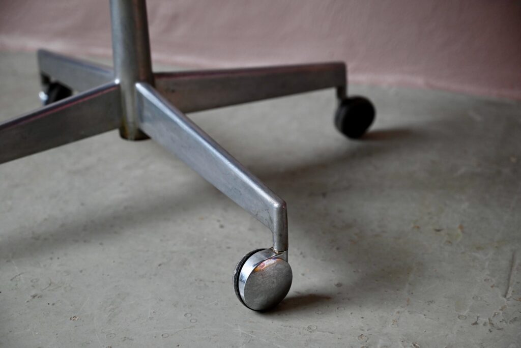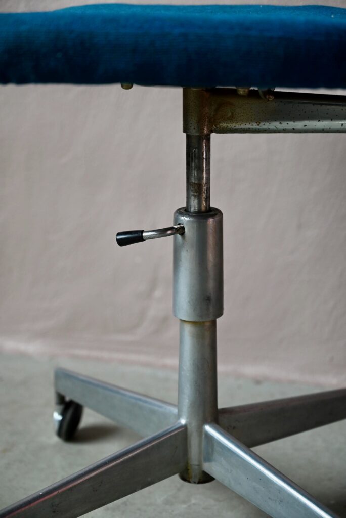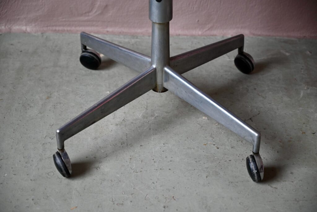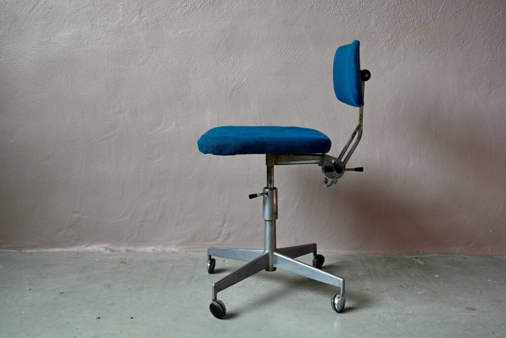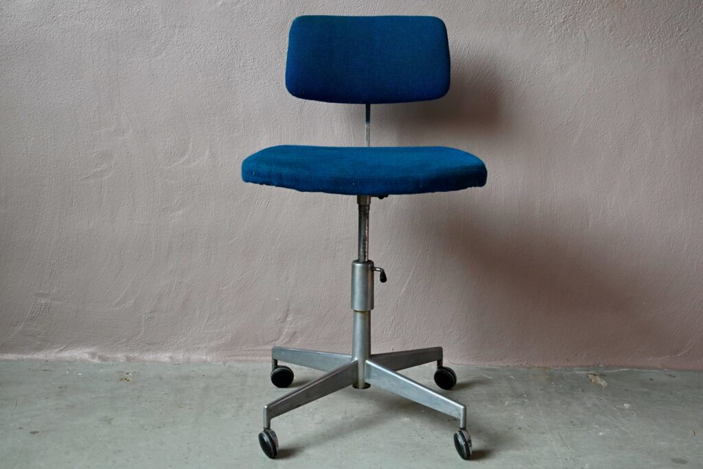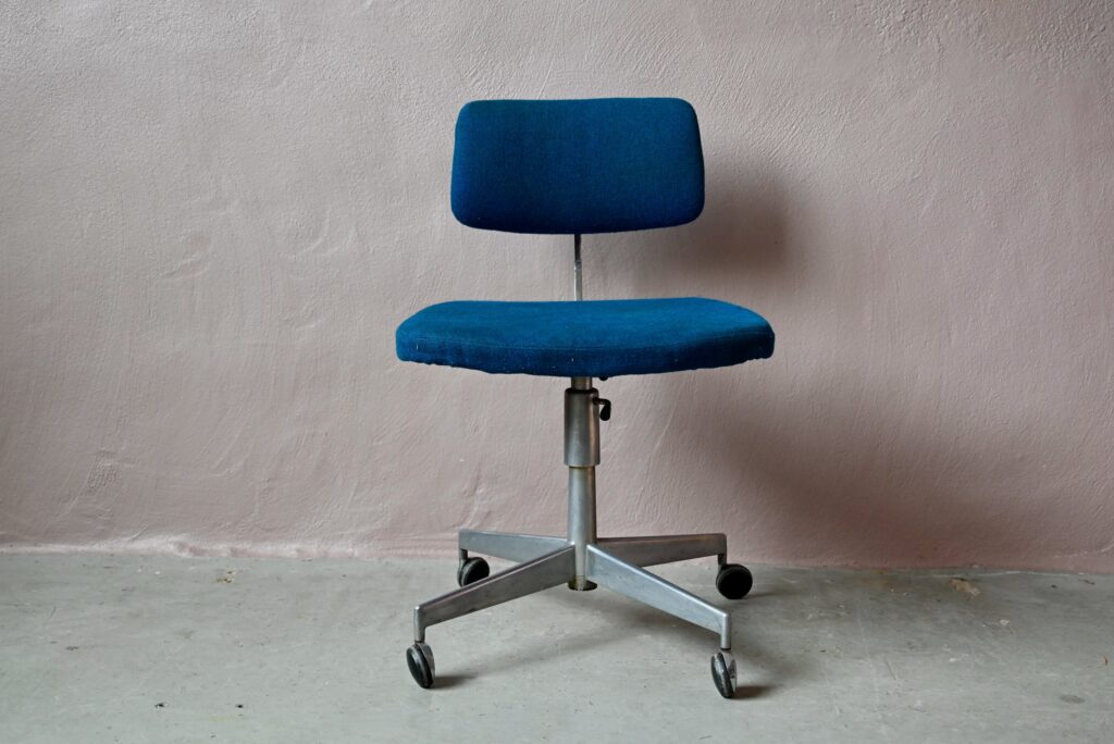 La chaise de bureau date des années 60. Elle a été éditée par la firme danoise Labofa. Son piétement étoile chromé comporte des roulettes. Assise et dossier comportent le tissu bleu d’origine. Il a été nettoyé, une discrète auréole demeure. La structure de la chaise est en chrome, des traces d’oxydation y sont visibles. La chaise pivote et est également réglable en hauteur. Un système de réglage permet aussi de régler la profondeur du dossier. La chaise de bureau offre une belle ergonomie.