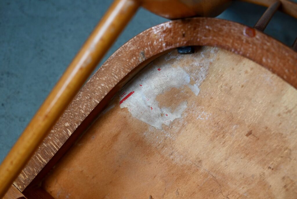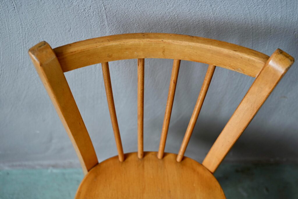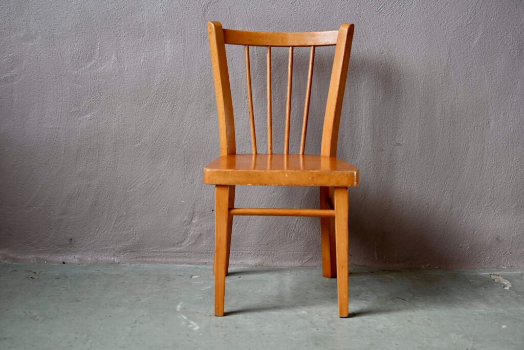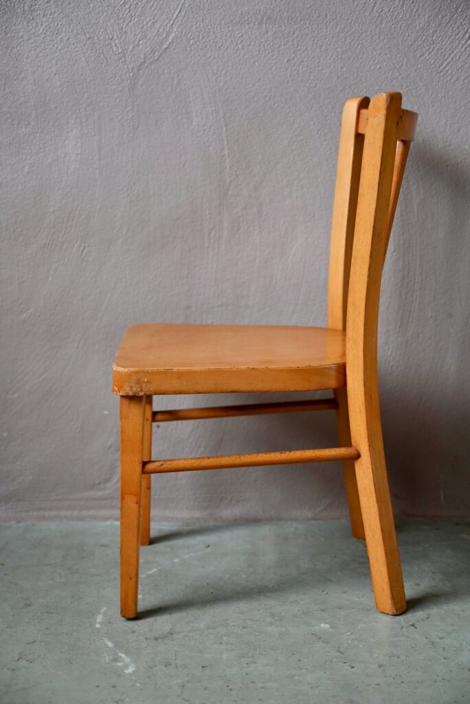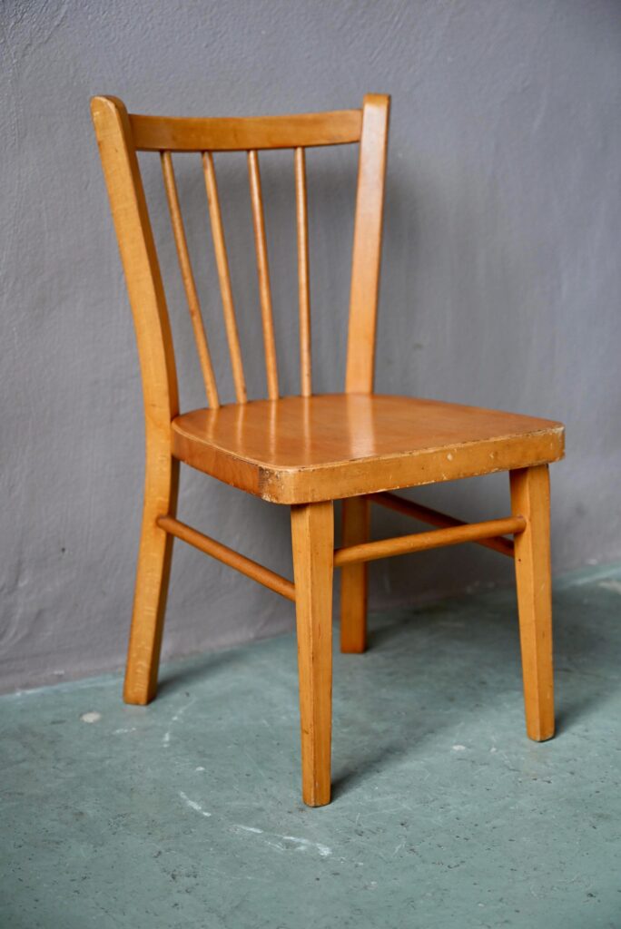 La chaise est en hêtre et contreplaqué. Elle est en bel état, d’une teinte miel dorée. Elle est stable, porte des traces d’usage légères visibles sur les photos. Associée à un petit bureau, elle sera une déco vintage parfaite pour une chambre d’enfant. La chaise est légère, confortable et d’un design malicieux. Un reste d’étiquette du fabricant est encore présent sous l’assise.