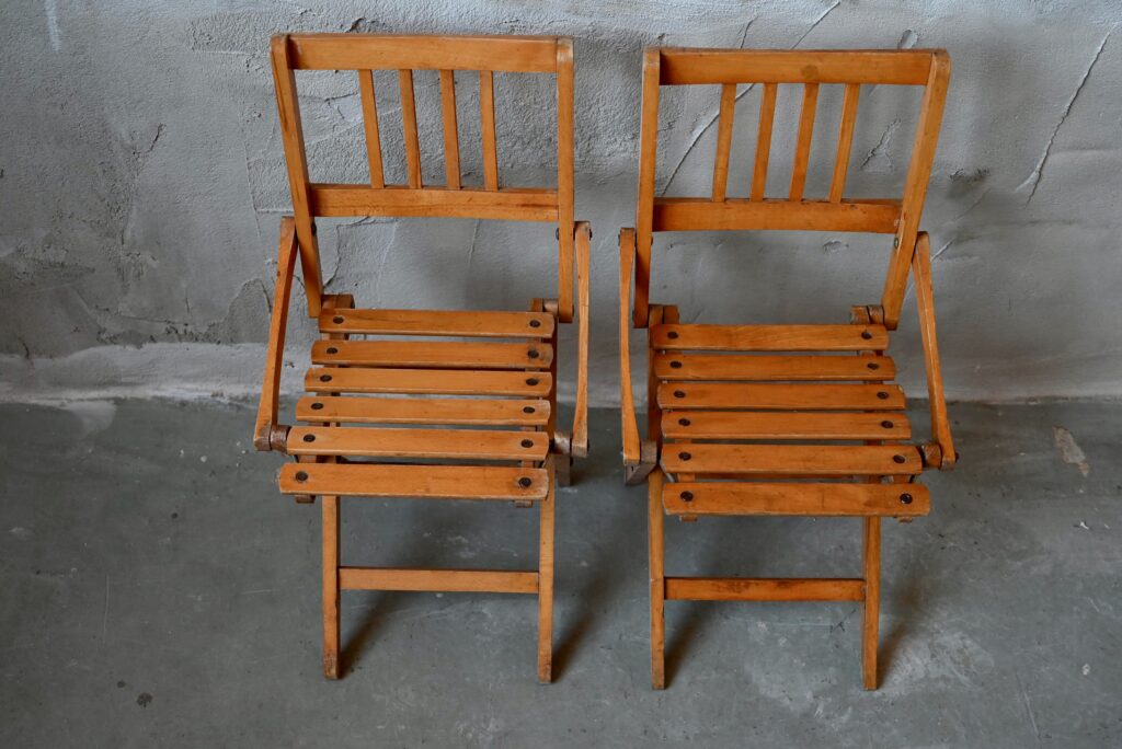 Les chaises enfant pliantes sont en hêtre massif, elles sont pliables. Anciennes, elles datent de la première moitié du 20ème siècle. Nous apprécions leur aspect bohème et délicieusement vintage. Elles sont parfaitement fonctionnelles, en bel état et vendues à la pièce.